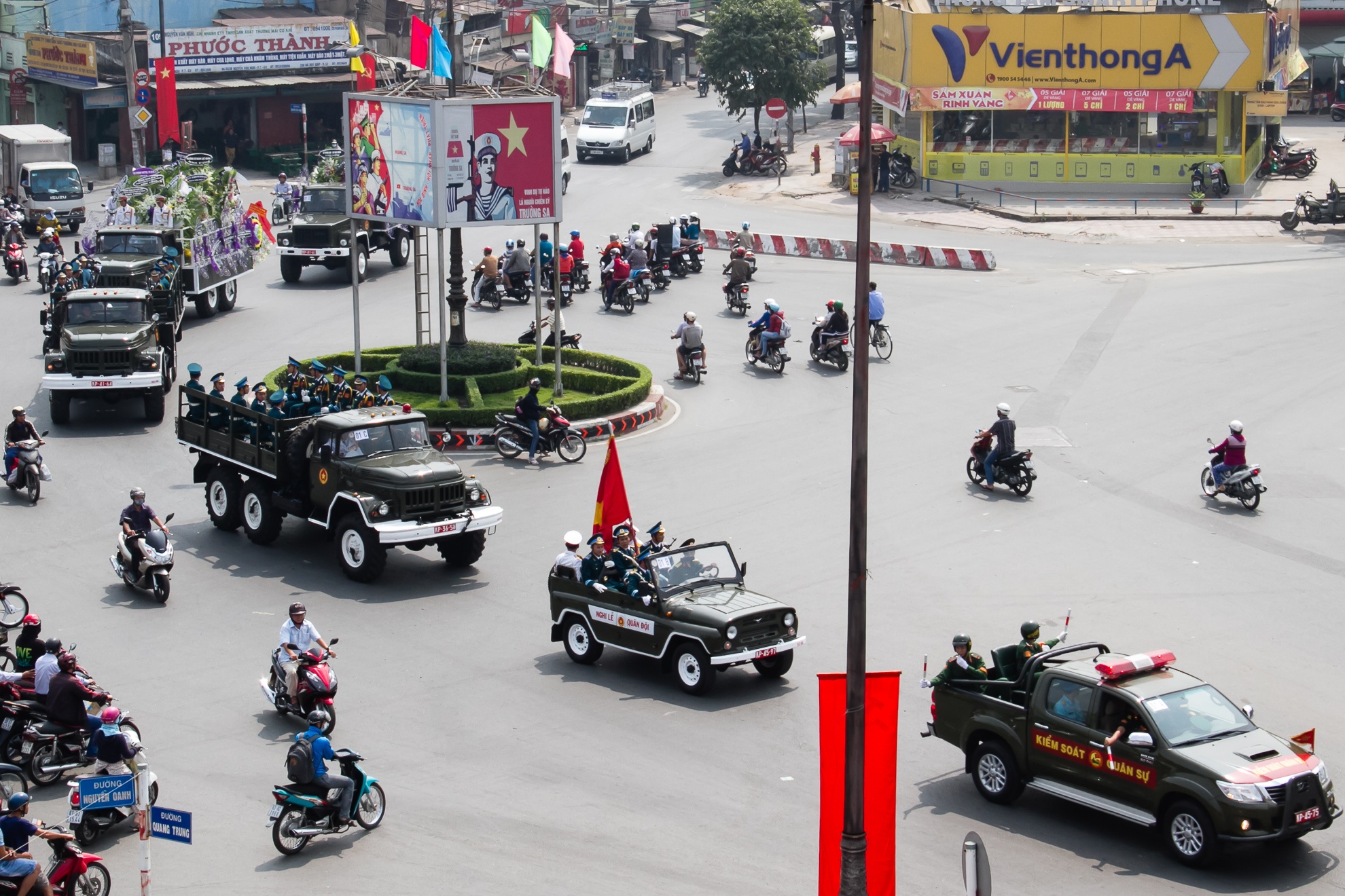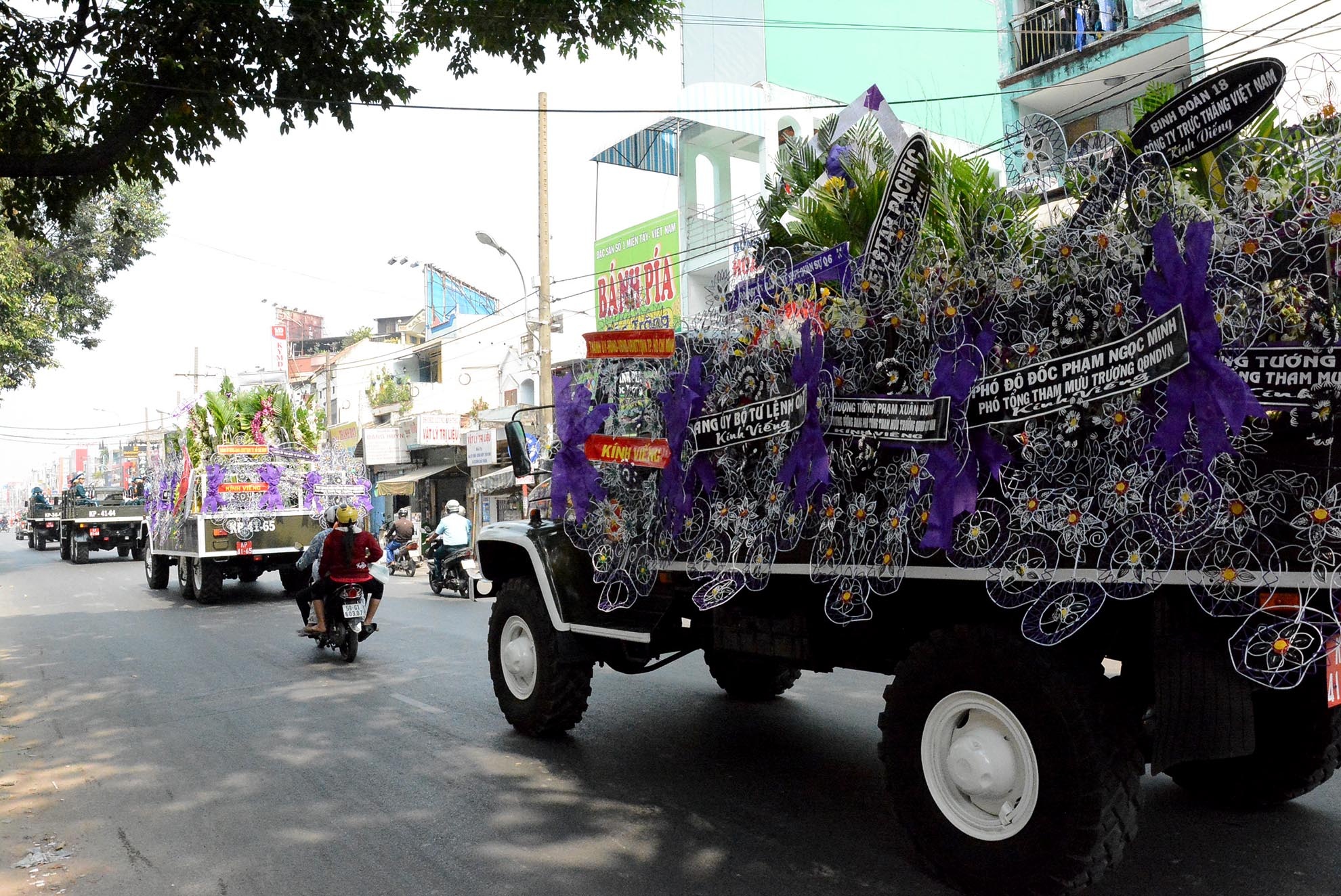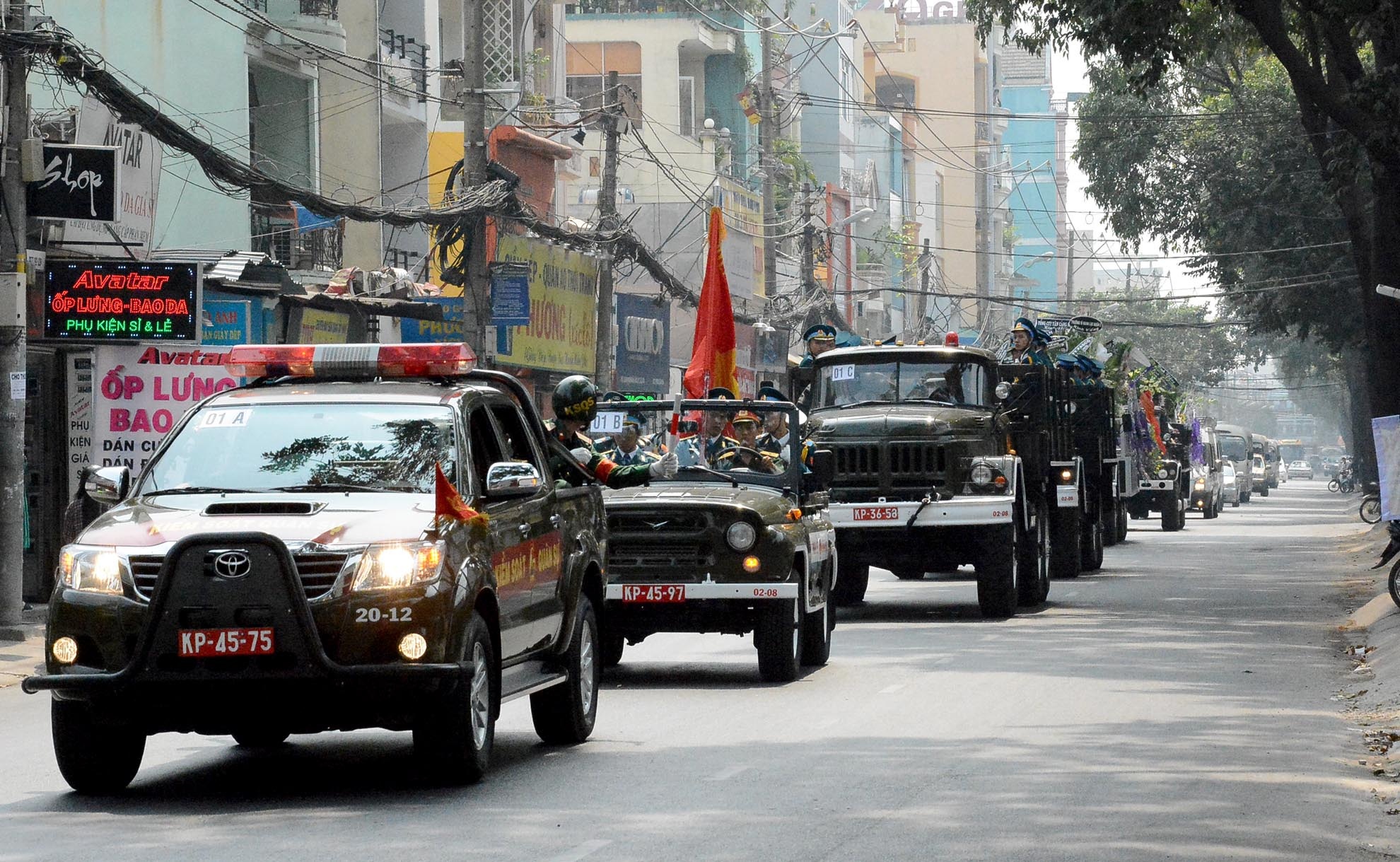 | Đoàn xe tang chở thi hài các quân nhân di chuyển trên đường Phạm Ngũ Lão (quận Gò Vấp) để đưa về nghĩa trang. |