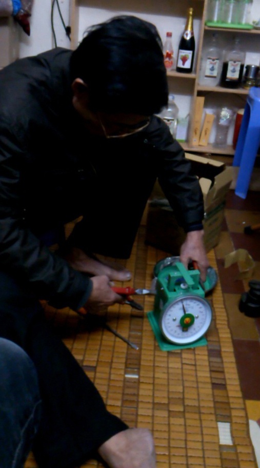 Trong căn nhà nhỏ, ngoài là nơi ở, nơi chứa đồ hàng thì còn là nơi để người này “độ” cân mỗi khi có khách yêu cầu. Chứng kiến cảnh ông chủ hàng “độ” lại cân mới biết được đồ nghề rất đơn giản. Chỉ có một quả cân đúng số lượng 1kg có dấu kiểm chứng của đo lường, một vài dụng cụ như kìm, tuốcnơvít... Sau đúng 10 phút tháo ra chỉnh sửa, chiếc cân từ lành đã thành “điêu”. Cục sắt lúc đầu 1kg, sau khi được “độ” lại thì cục sắt này đã nặng lên thành 1,1kg. Tuy nhiên, cân “điêu” ở đây nếu không phải “người trong cuộc” thì rất khó có thể nhận ra được. Người đàn ông này còn khuyên chúng tôi, mỗi kilôgram chỉ nên ăn cắp từ 100-200 gram thôi, "ăn nhiều sẽ lộ ngay".