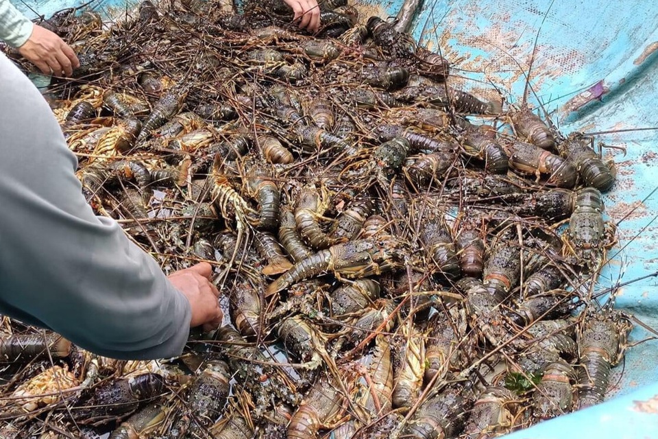 Tôm hùm xanh Phú Yên chết ngộp vì lũ. Ảnh: NCVV. |