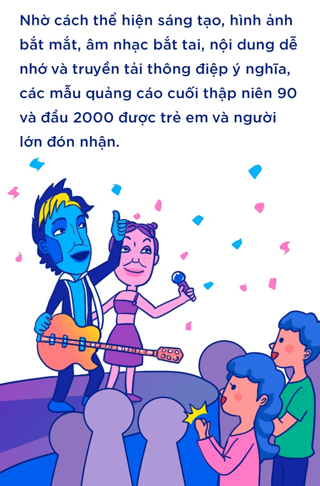 Ngoài Những bông hoa nhỏ, phim hoạt hình Doraemon, Tom & Jerry, Thuỷ thủ Popeye hay phim Tây Du Ký, một trong những nội dung được trẻ con thời đó xem và thích thú bàn luận chính là chương trình quảng cáo. Thậm chí, có những clip quảng cáo đã trở thành “huyền thoại” của lứa 8X, 9X; slogan hoặc hội thoại trở thành câu cửa miệng của trẻ em và người lớn suốt một thời gian dài.