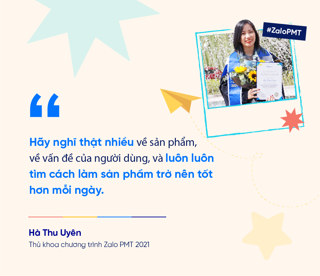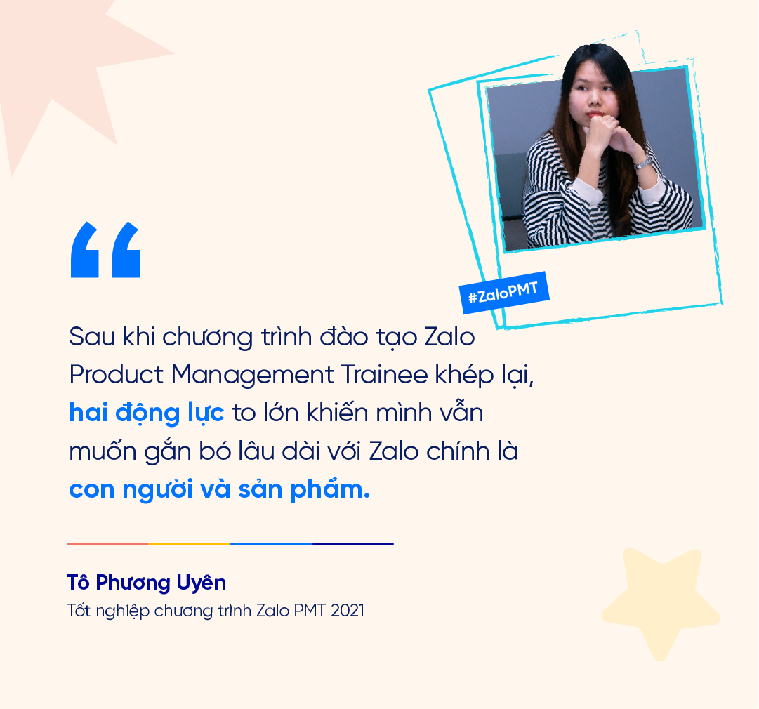 Chia sẻ với Zing, Phương Uyên cho rằng kết thúc chương trình Zalo PMT 2021, Uyên có hai động lực chính để tiếp tục gắn bó với công việc phát triển sản phẩm tại nơi đây.