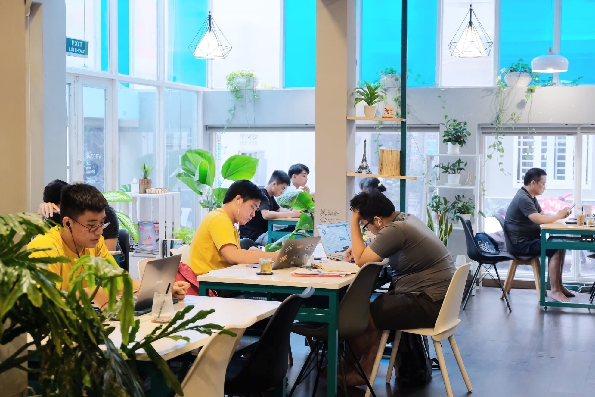 | Vào dịp lễ, nhiều bạn trẻ tới các quán cà phê để làm việc. |