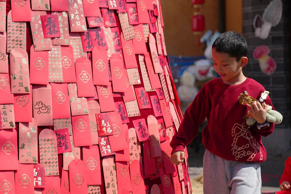 Cậu bé đi ngang qua một tác phẩm nghệ thuật được trang trí bằng những phong bì đỏ ở Mạnh Tử, tỉnh Vân Nam, ngày 17/2. Ảnh: Liu Ranyan. |