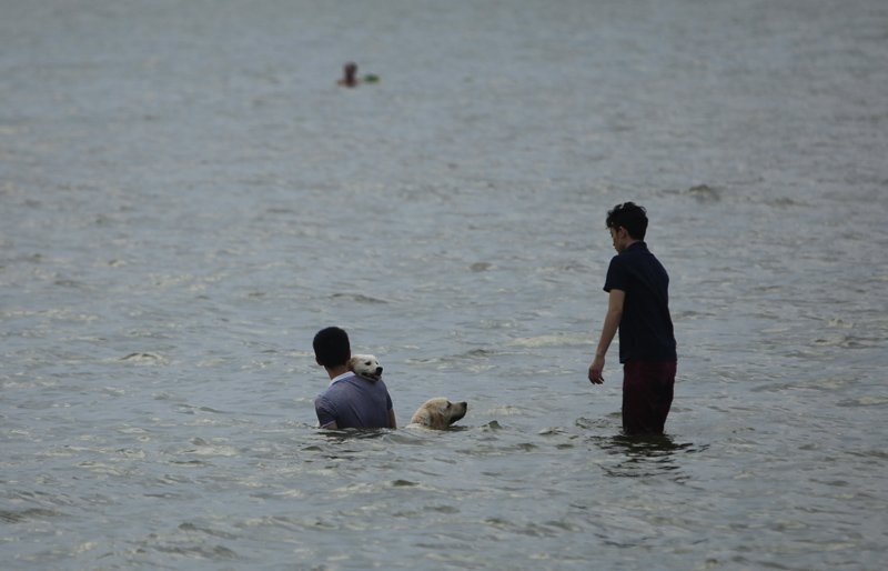 | Các chú chó cũng được chủ nhân dắt ra hồ tắm mát. |