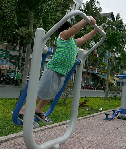 | 10 năm, trẻ béo phì ở Việt Nam tăng 9 lần. Trong ảnh: bé tập thể dục để giảm béo phì ở bờ kênh Nhiêu Lộc, Q.Tân Bình, TP.HCM. |