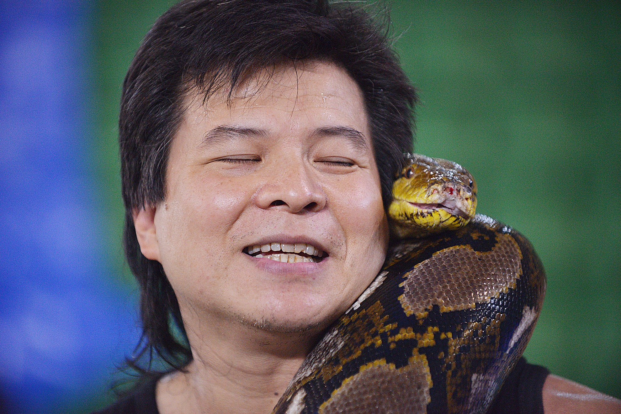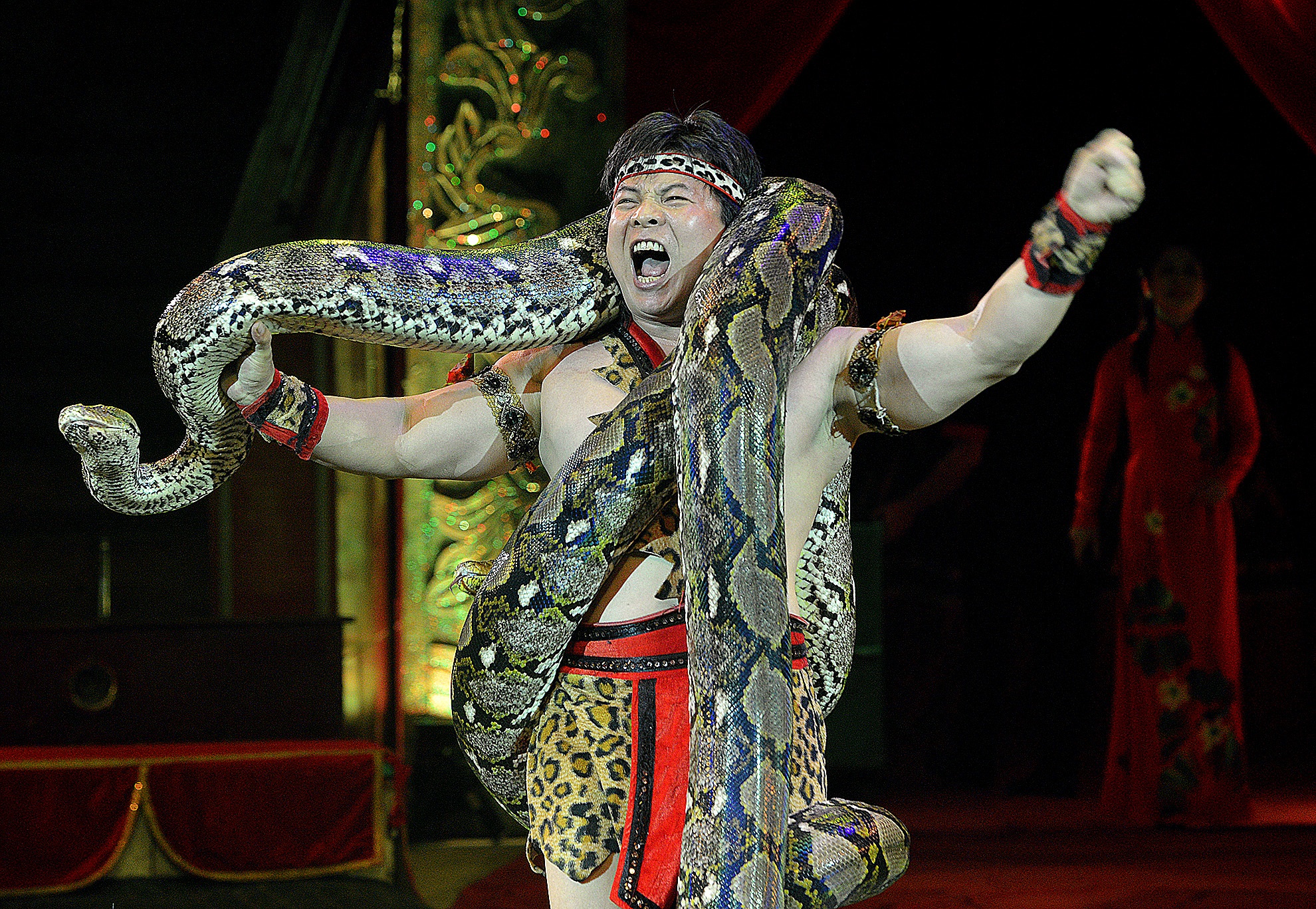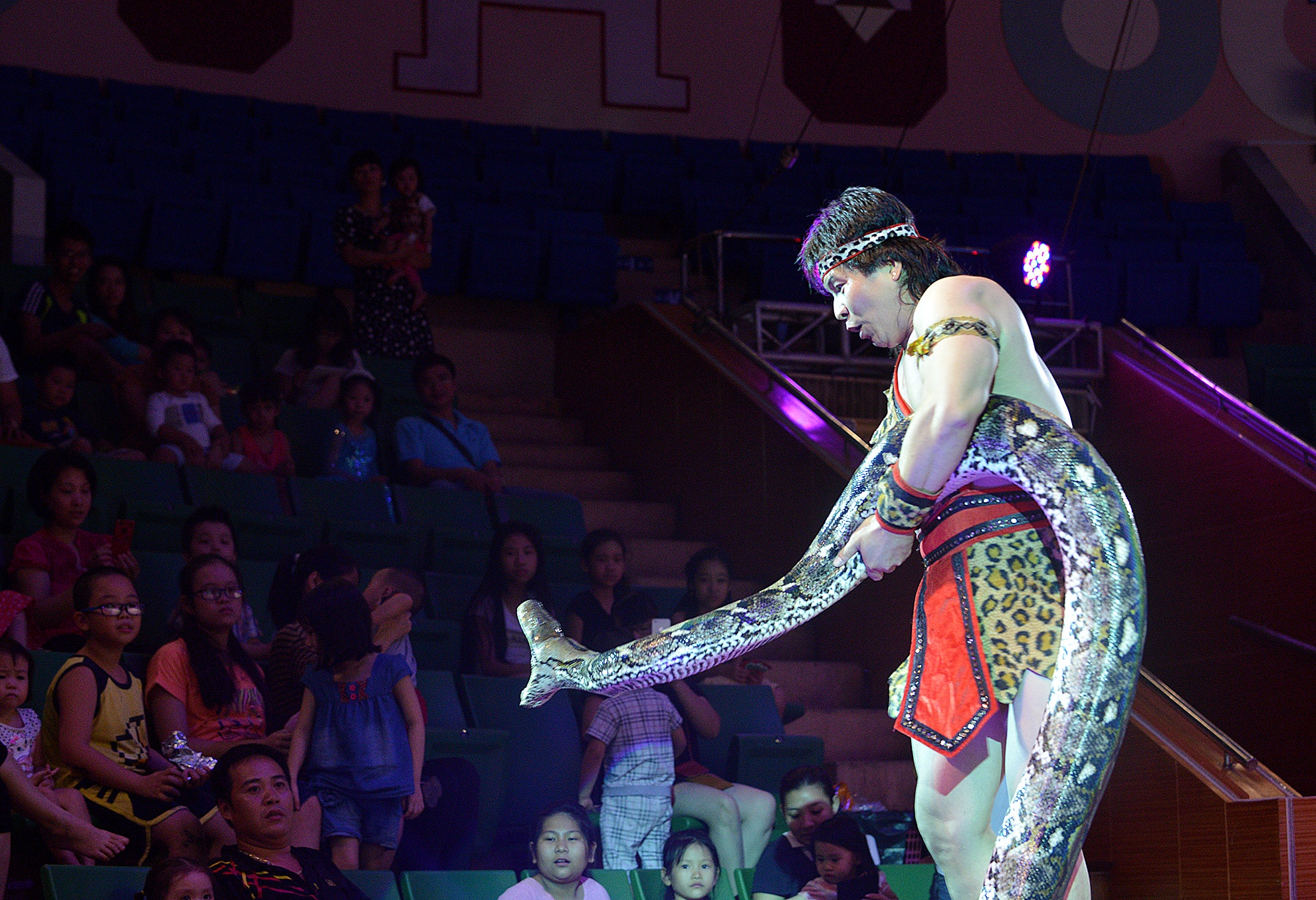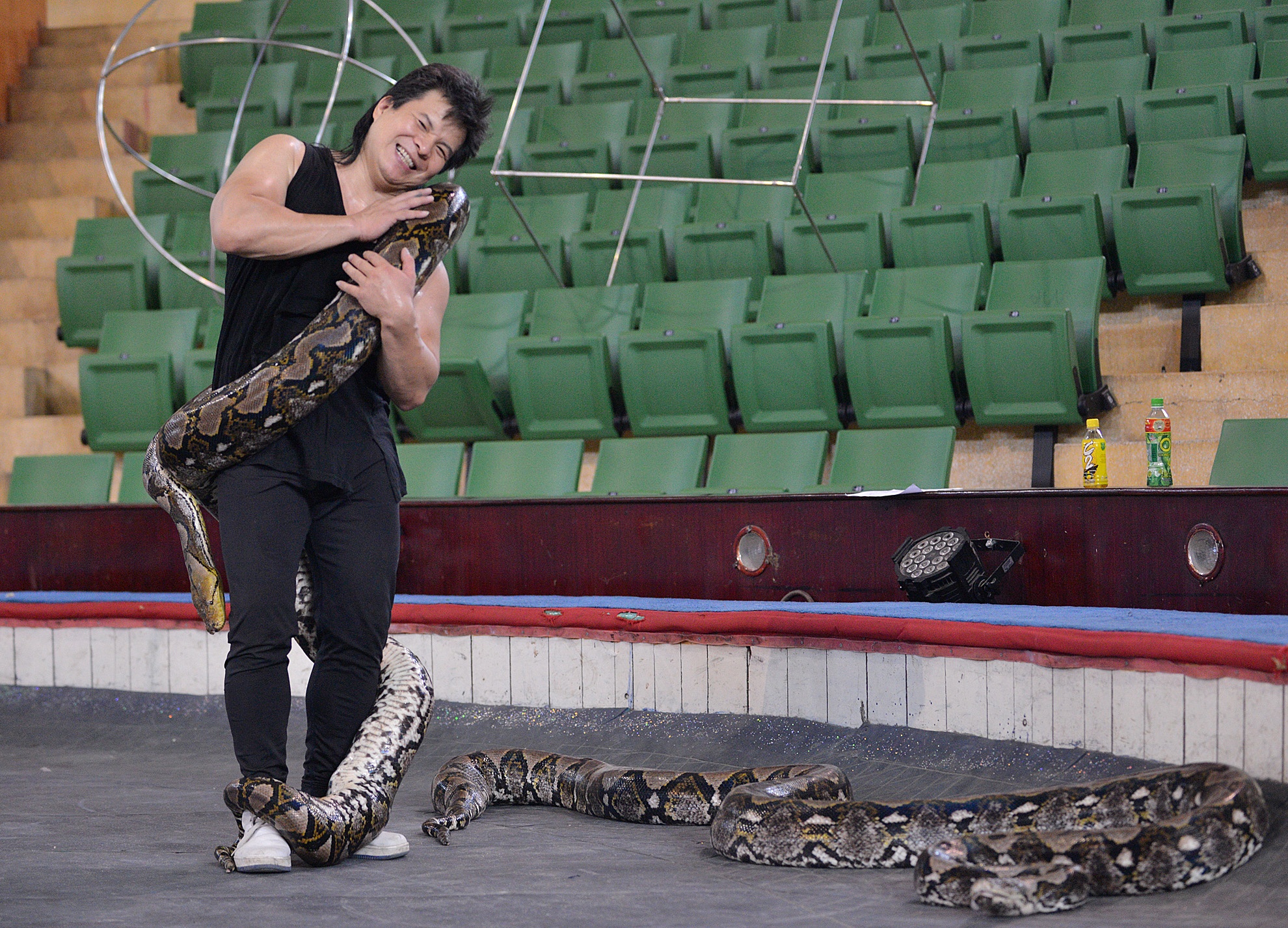 Nghệ sĩ ưu tú Tống Toàn Thắng trung thành với xiếc trăn 23 năm nay. Mỗi tiết mục anh thường diễn với hai chú trăn.