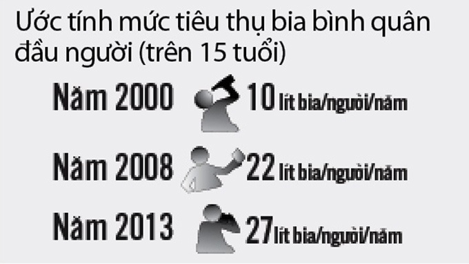 Theo thống kê chưa đầy đủ của Hiệp hội Bia rượu - nước giải khát Việt Nam (VBA), nếu năm 2000 mức tiêu thụ rượu bia bình quân đầu người (trên 15 tuổi) từ 10,04 lít bia/người/năm, thì đến năm 2008 con số này đã là 22 lít/người/năm, và hiện nay đã trên 27 lít/người/năm. Theo một chuyên gia trong ngành thực phẩm - đồ uống, tỉ lệ thực uống có thể sẽ cao hơn rất nhiều so với con số thống kê, vì “chỉ cần nhìn vào tốc độ tăng trưởng sản xuất của các doanh nghiệp đều thấy con số triệu lít/năm giờ đây đã thay bằng tỉ lít/năm”.