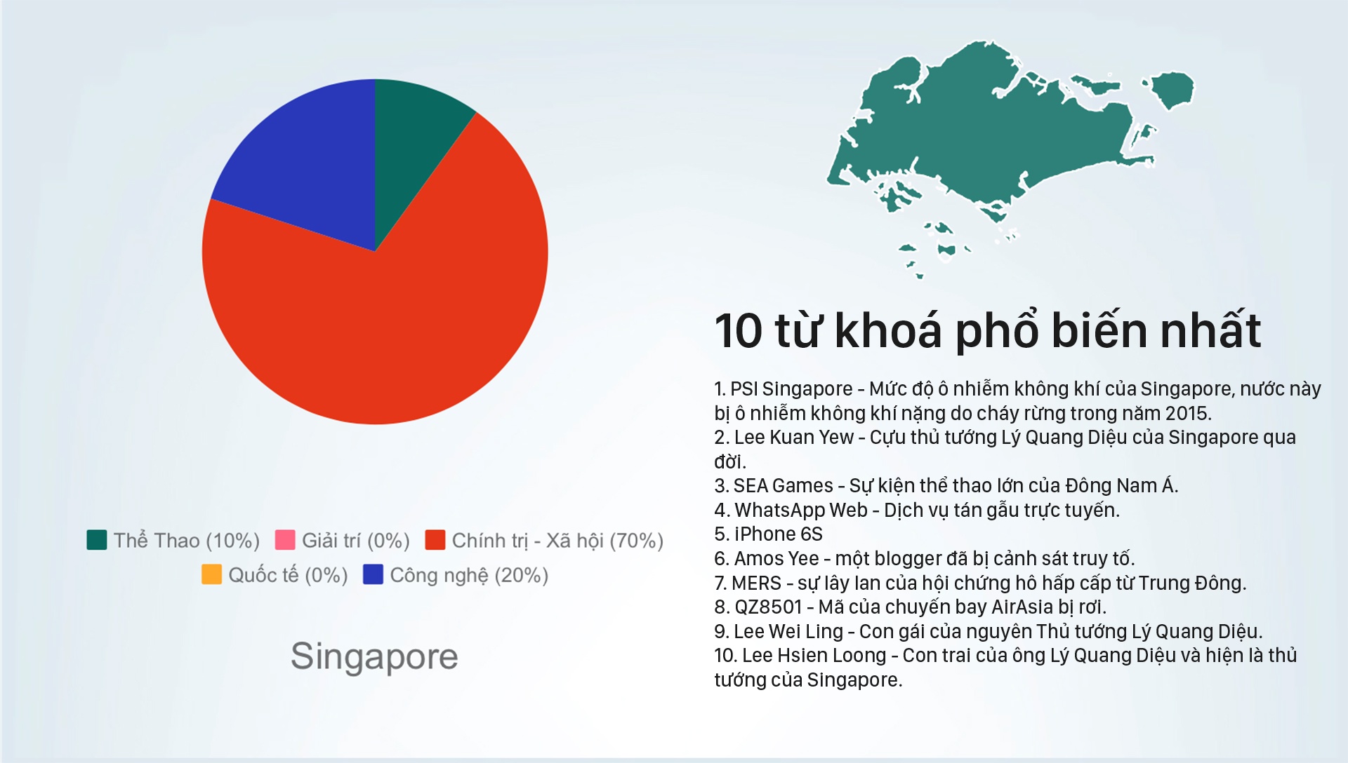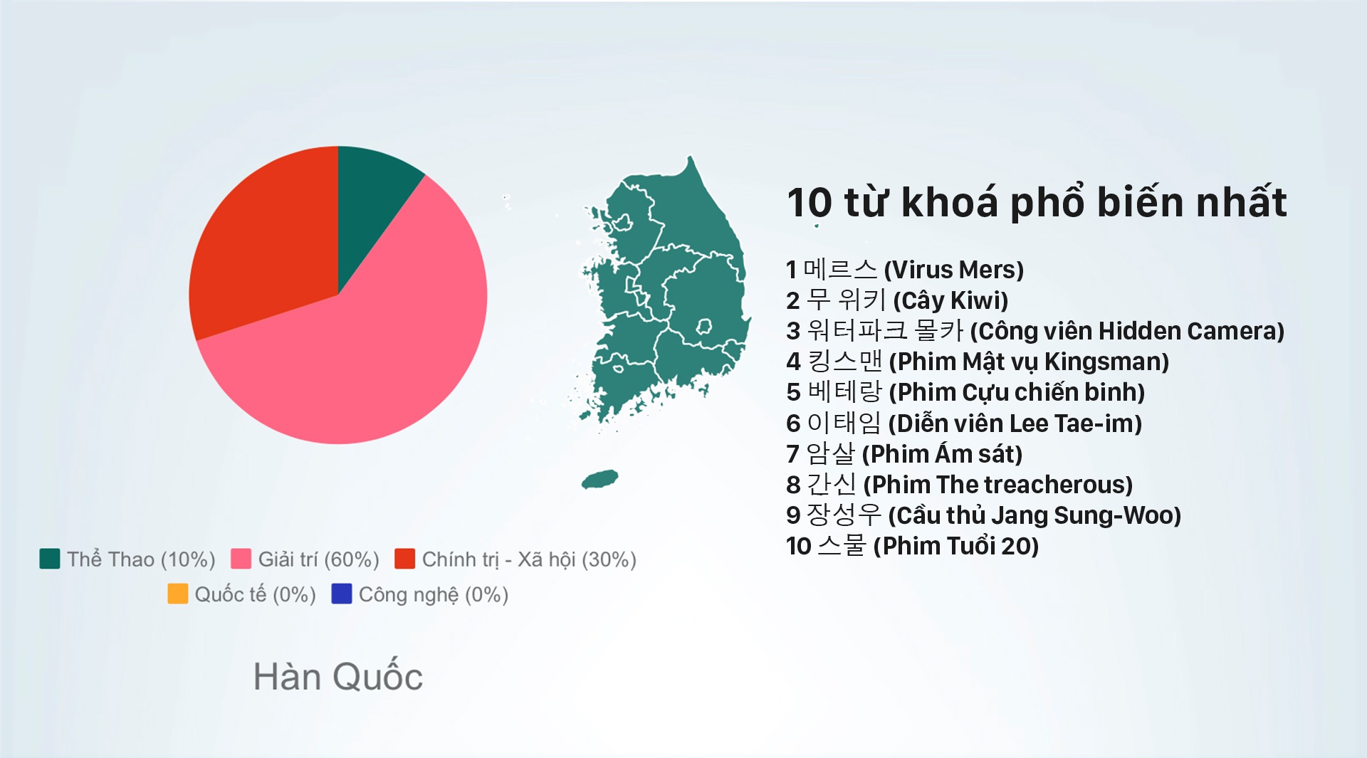 | Là "kinh đô giải trí của châu Á", Hàn Quốc cũng có tỷ lệ tìm kiếm liên quan đến lĩnh vực này khá cao, nhưng không quá áp đảo. Người dân nước này vẫn quan tâm đến chính trị - xã hội và thể thao. |
