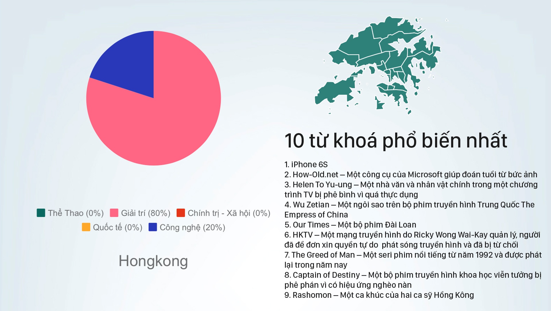 | Hong Kong có tỷ lệ gần với Việt Nam khi người dân nước này cũng dành phần lớn thời gian để tìm kiếm những từ khoá liên quan đến giải trí. Tuy nhiên, 2 từ khóa liên quan đến công nghệ là iPhone 6S và How-Old.net chiếm hai vị trí dẫn đầu. |