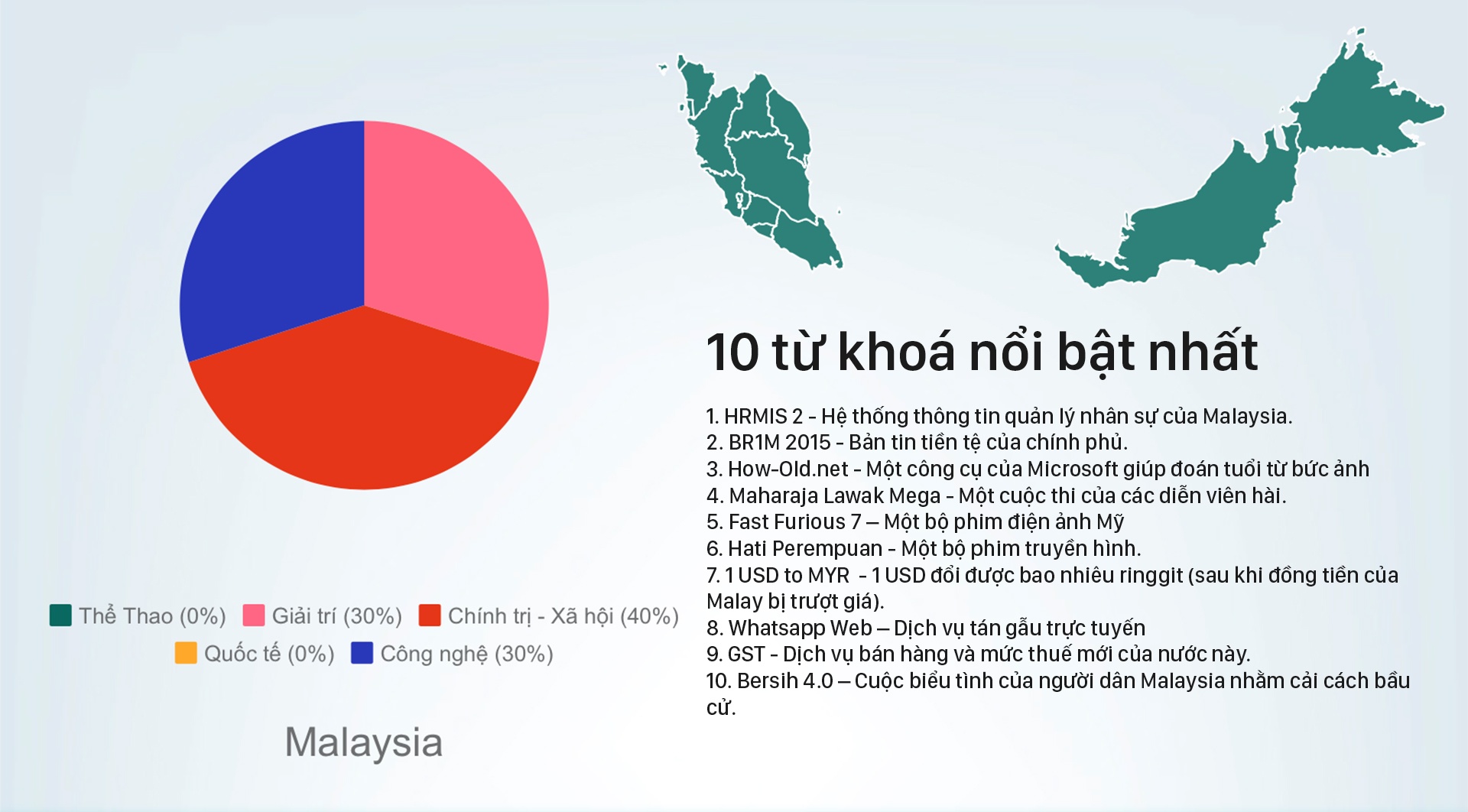 | Người dân Malaysia quan tâm đến công nghệ, các vấn đề xã hội và giải trí. Ba lĩnh vực này chiếm tỷ lệ khá cân bằng. |