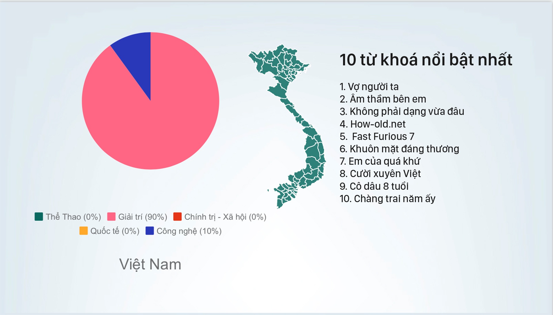 | 9/10 từ khoá được tìm nhiều ở Việt Nam đều là những ca khúc đình đám trong giới trẻ, game show truyền hình hoặc tựa đề các bộ phim. Từ khoá công nghệ duy nhất là How-old.net (trang web đoán tuổi thông qua ảnh chân dung, thực chất cũng chỉ là một công cụ mua vui). |