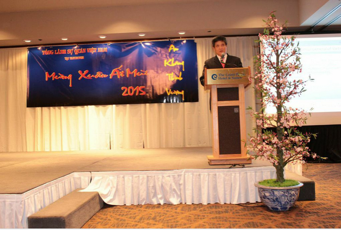 Tổng Lãnh sự Trần Quang Dũng phát biểu khai mạc buổi tiệc, điểm lại những thành tựu trong việc thúc đẩy quan hệ giữa Việt Nam và các bang của Canada trong năm qua. Ông cũng ghi nhận sự đóng góp, giúp đỡ của bà con kiều bào, đồng thời gửi lời chúc Tết đến quan khách nước ngoài, bà con người Việt và du học sinh tại Canada. |