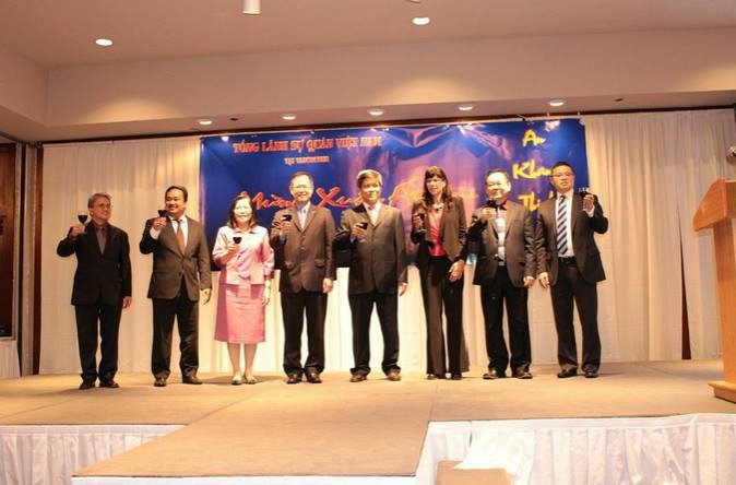 | Ngày 7/2, Tổng Lãnh sự quán Việt Nam tại thành phố Vancouver, Canada, tổ chức tiệc mừng xuân Ất Mùi tại khách sạn Coast Plaza, trung tâm thành phố Vancouver. Các quan chức địa phương cùng hơn 100 kiều bào đang sinh sống và làm việc tại Vancouver đã tới dự buổi tiệc tất niên. |