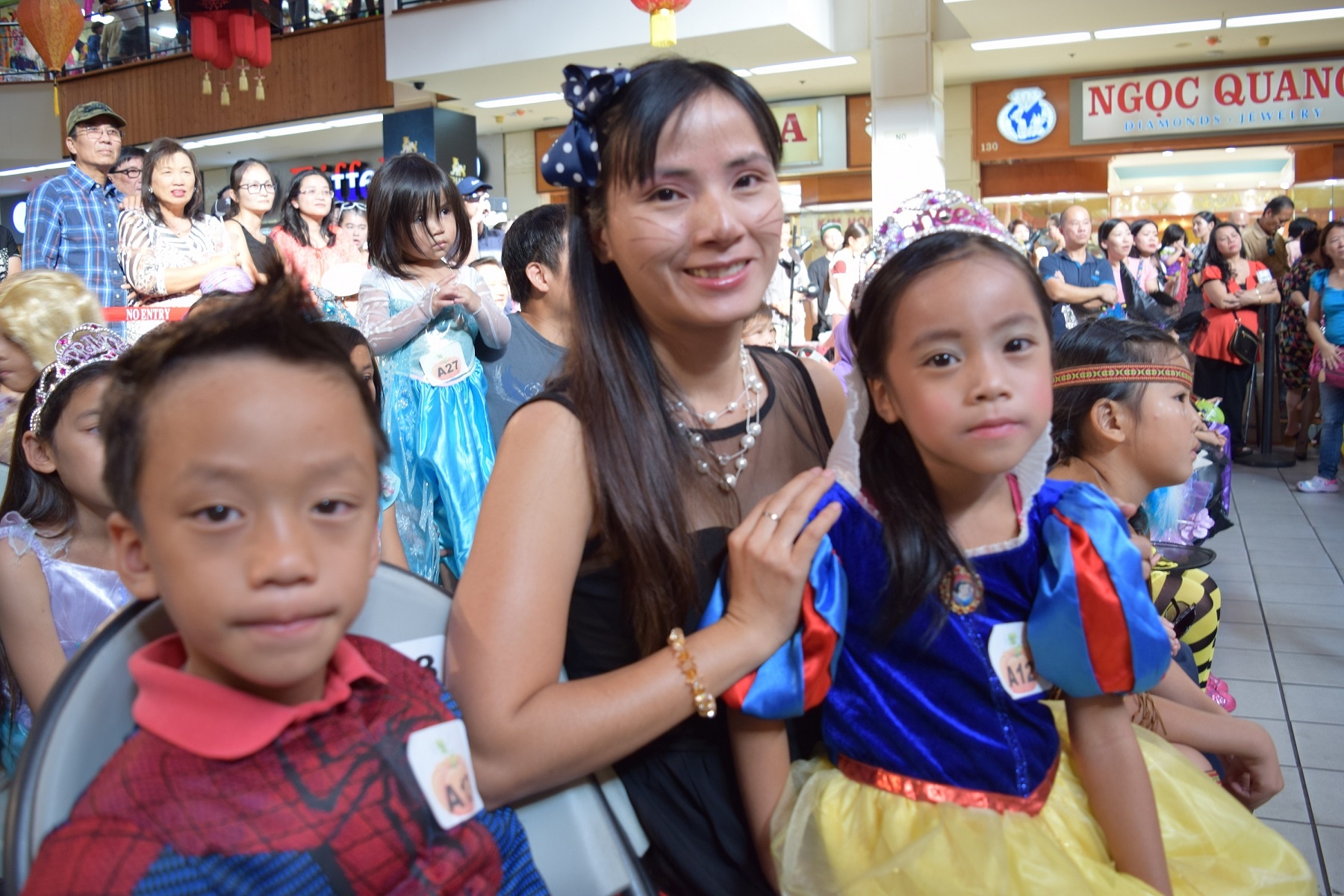 | Phụ huynh đưa các con đến tham gia lễ hội hóa trang diễn ra tại thương xá Phước Lộc Thọ. |