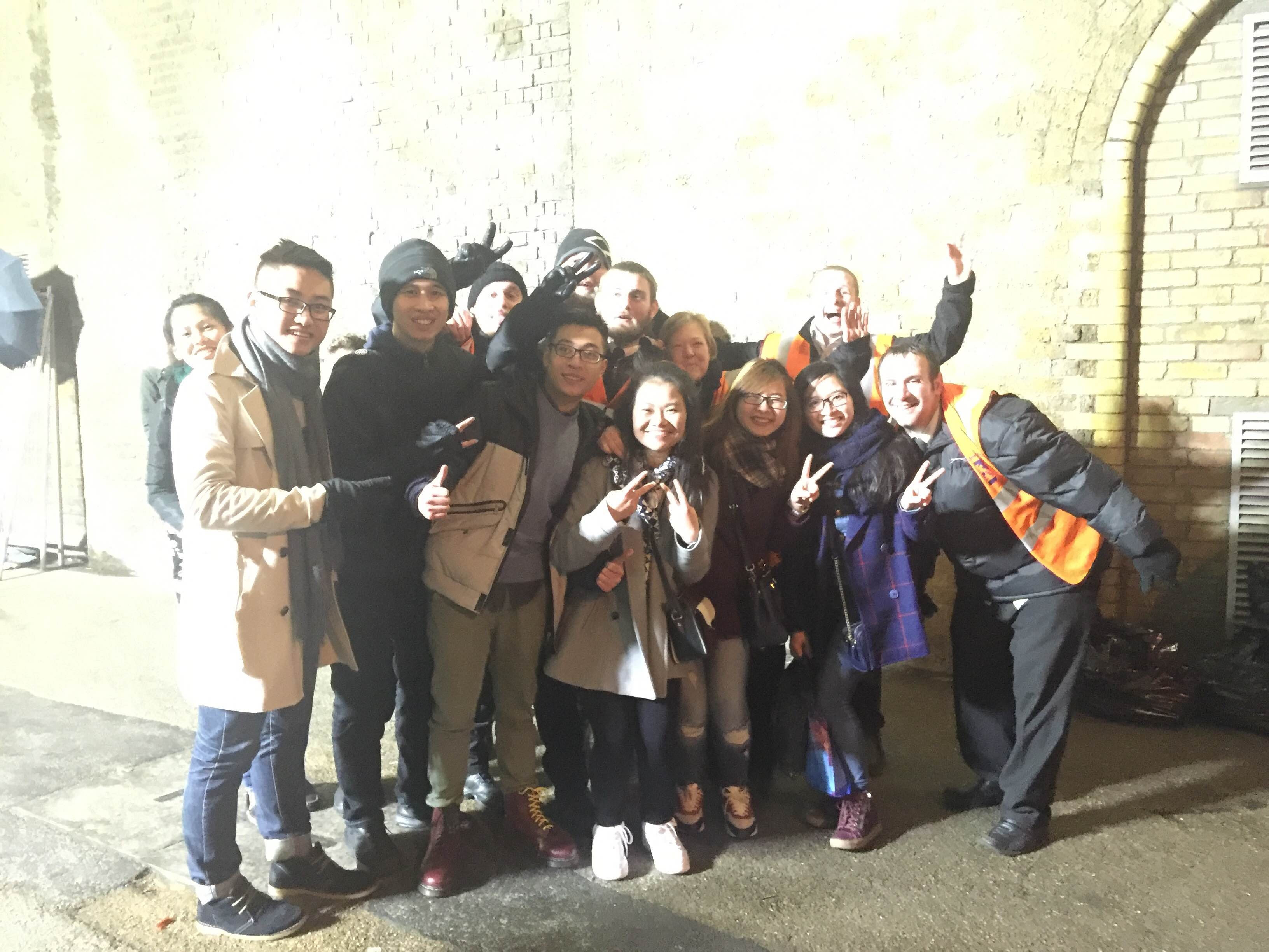 Năm mới 2016 gõ cửa các quốc gia châu Âu muộn hơn châu Á vài tiếng. Bạn Trịnh Đình Tuấn Anh, du học sinh tại Anh, cùng nhóm bạn rất háo hức chờ đón khoảnh khắc giao thừa ở vòng quay London Eye ở thủ đô London đêm 31/12. "Mình đã xếp hàng để mua vé từ 5h chiều. Dù rất đông nhưng mọi người đều thân thiện và đều chung tâm trạng hồ hởi. Đặc biệt, việc di chuyển bằng phương tiện công cộng đều miễn phí. An ninh được thắt chặt".