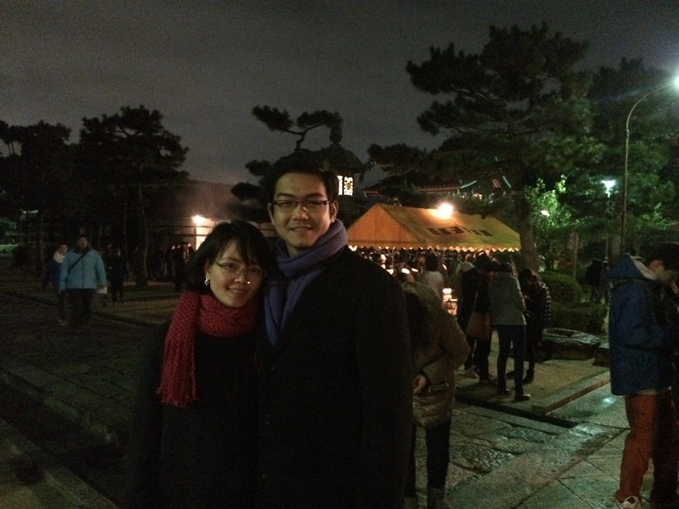 Nguyễn Cao Hồng Ngọc và Đỗ Kiên Trung, du học sinh Việt Nam tại Nhật Bản, đón giao thừa cùng bạn bè tại chùa Hyakumanben Chionji, thành phố Kyoto. Ảnh: Phạm Tiền |