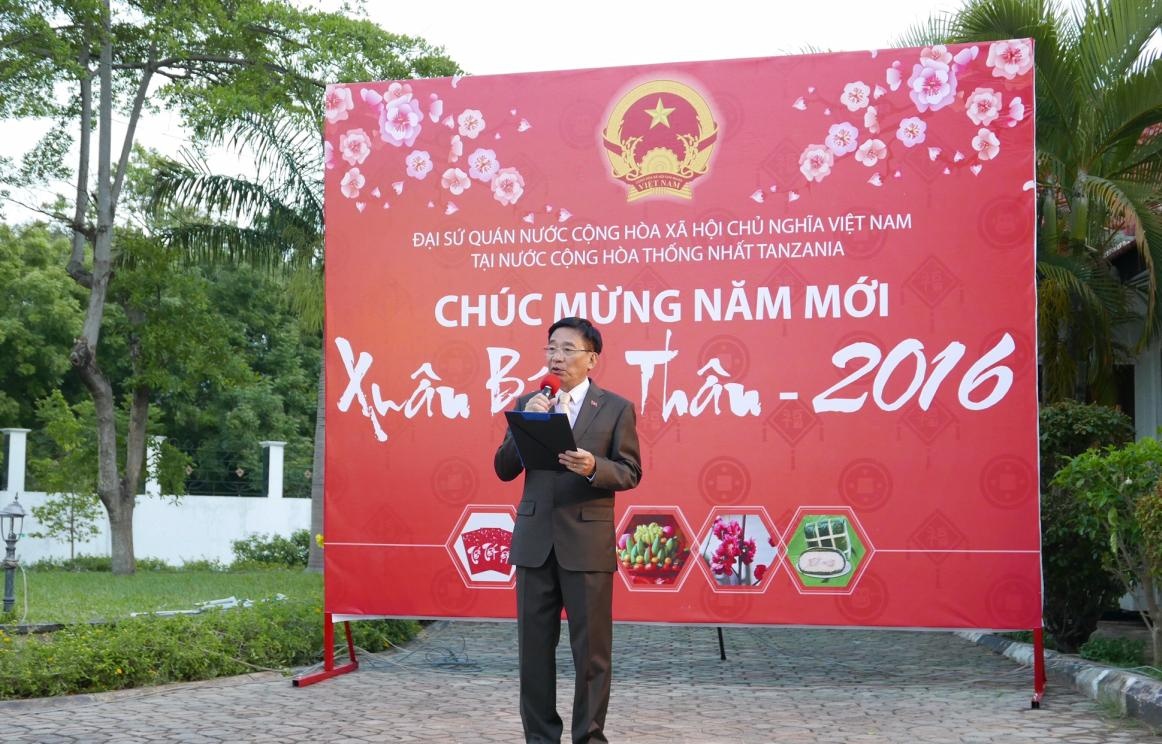 Ngày 31/1, tại trụ sở Đại sứ quán Việt Nam tại Tanzania, Đại sứ Võ Thành Nam và phu nhân đã chủ trì buổi chiêu đãi gặp mặt Mừng Xuân Bính Thân 2016 cho cộng đồng người Việt Nam tại Tanzania. Đại sứ đã gửi đến cộng đồng lời chúc mừng tốt đẹp nhất trong năm mới, mong cộng đồng tiếp tục phát huy truyền thống đoàn kết, vượt qua khó khăn, giữ gìn và xây dựng hình ảnh tích cực của Việt Nam tại Tanzania, đóng góp ngày càng nhiều cho sự phát triển quan hệ song phương giữa Việt Nam và Tanzania. Ảnh: Đại sứ quán Việt Nam tại Tanzania cung cấp |
