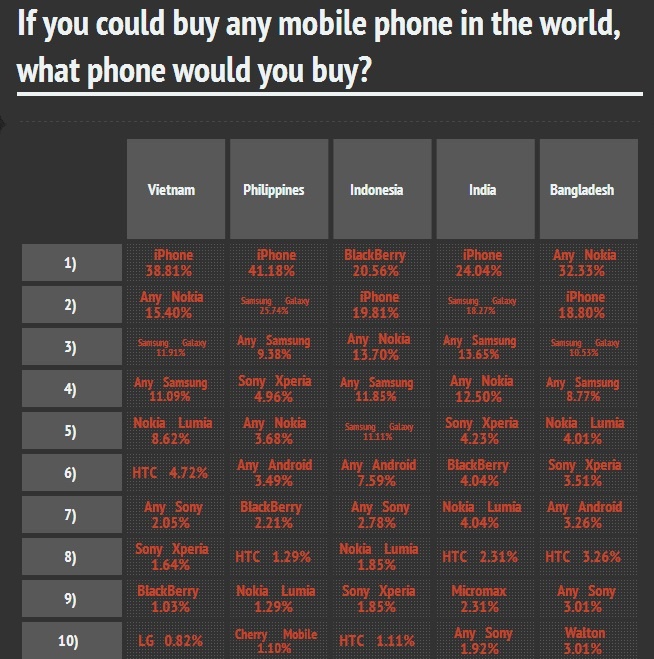 iPhone là thiết bị được ưa chuộng nhất tại hầu hết các quốc gia có trong bản khảo sát: Đứng đầu tại Việt Nam, Philippines, Ấn Độ và đứng thứ 2 tại Indonesia, Bangladesh.
