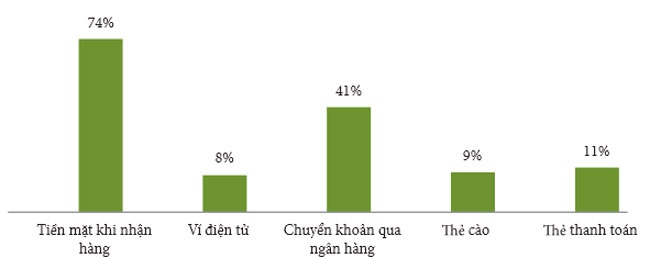 Tuy giao dịch qua mạng nhưng tiền mặt vẫn là hình thức thanh toán chủ yếu của của các kênh mua sắm trực tuyến, với số người tham gia khảo sát trả lời "có" lên tới 74%. Thẻ thanh toán, chuyển khoản qua ngân hàng là những phương thức ít phổ biến hơn, chiếm 11% và 41%.