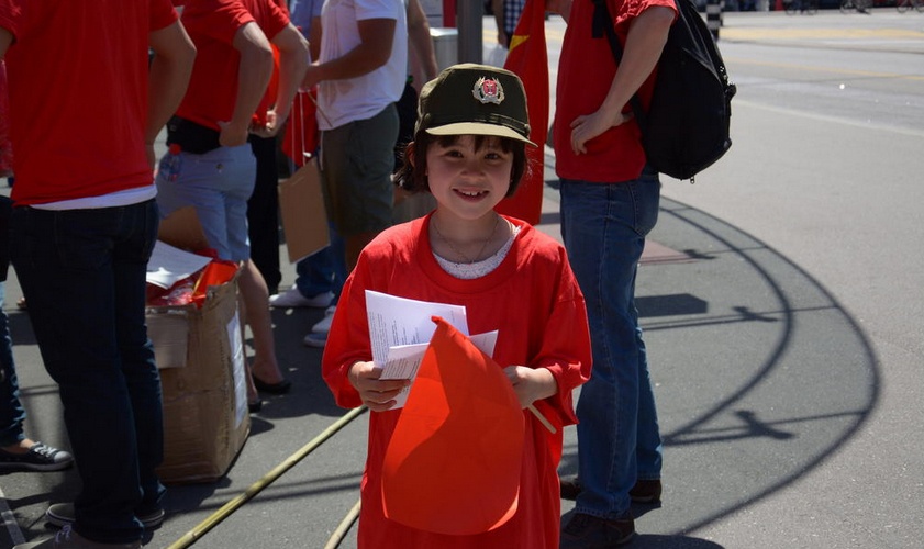 Mặc dù ban tổ chức thông báo cuộc biểu tình bắt đầu từ 14h, song ngay từ sớm, nhiều đoàn người rực đỏ với áo và cờ đỏ sao vàng đã đổ về trung tâm thành phố. Ngoài cờ Tổ quốc, nhiều người còn mang theo cả những "sáng tác" riêng như hình ảnh chim bồ câu, biểu tượng của hòa bình. Những em bé mặc chiếc áo đỏ với hình cờ tổ quốc. |