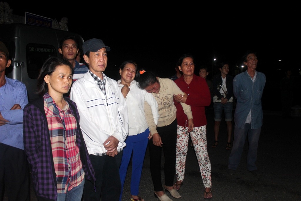 | Người thân của ngư dân Chung Đức Hùng vật vờ ngồi chờ tàu SAR 413 đem thi thể của ông vào bờ. |
