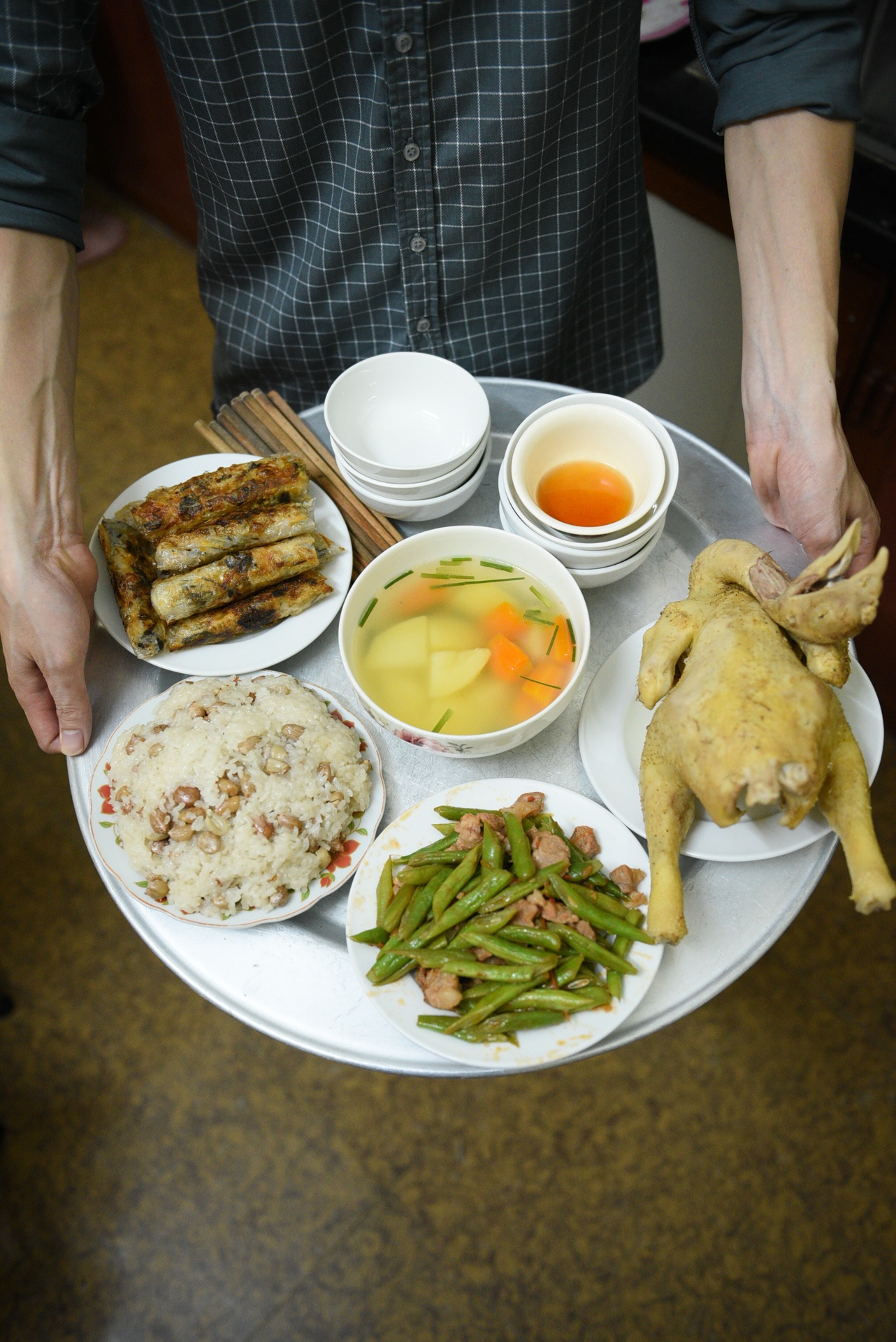 | Vì nhà ít người nên tôi chỉ chuẩn bị một mâm cỗ nhỏ để cúng gia tiên. Nhưng vẫn đầy đủ những món truyền thống: gà luộc, nem rán, canh khoai… |
