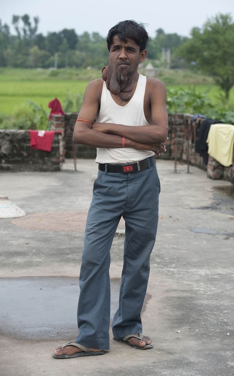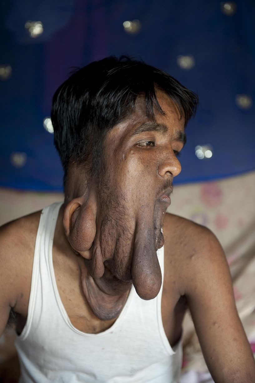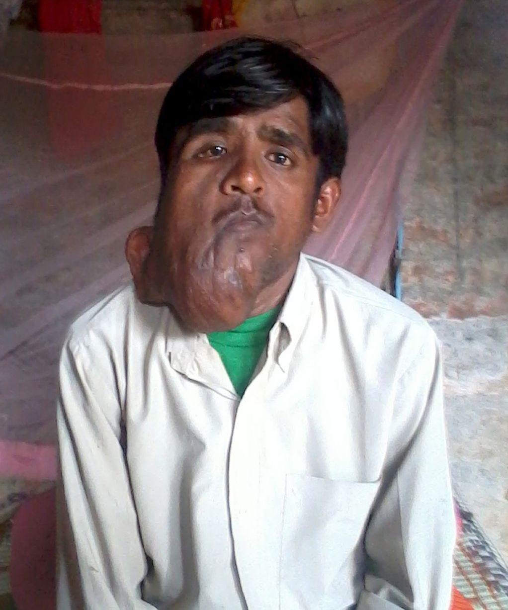 “Người voi” có tên thật là Lalit Ram, năm nay 26 tuổi, quê ở Lorika, phía đông Ấn Độ. Từ bé, “người voi” phải chịu đựng một chứng bệnh về gene có tên neurofibromatosis với những bướu lớn ở trên mặt. Và đây chính là lý do khiến anh đến giờ vẫn chưa thể tìm được “một nửa đích thực” của mình. Các thầy tu ở địa phương bảo rằng anh có thể sẽ không bao giờ lấy được vợ do có diện mạo dị thường. Ảnh: Mirrornews.