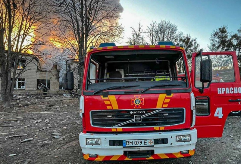 Xe cứu hỏa đỗ gần một bệnh viện bị hư hại ở tỉnh Sumy sau một vụ pháo kích. Ảnh: Cơ quan Dịch vụ khẩn cấp nhà nước Ukraine |