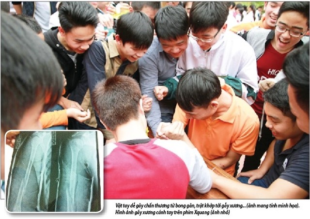 Lý giải về điều này, TS.BS Võ Tường Kha - Phó giám đốc BV Thể thao Việt Nam nói: vật tay hoàn toàn có thể dẫn đến trật khớp, bong gân, thoát vị đĩa đệm, gãy xương tay... Trò vật tay huy động rất nhiều cơ, khớp tham gia như cơ lưng, cơ ngực, cơ vai, cơ cẳng tay, khớp vai, cột sống, cánh tay, các khớp tay...