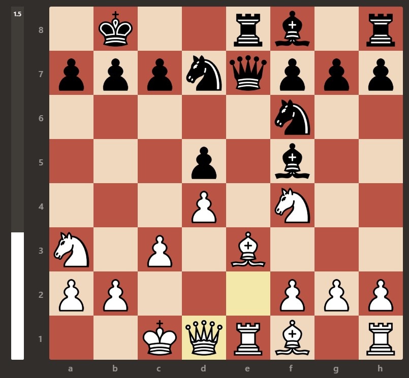 | Hikaru (quân trắng) đi nước sai lầm hậu d1, tạo điều kiện cho Trường Sơn thí hậu ở a3 và giành lợi thế. Ảnh: Chess. |