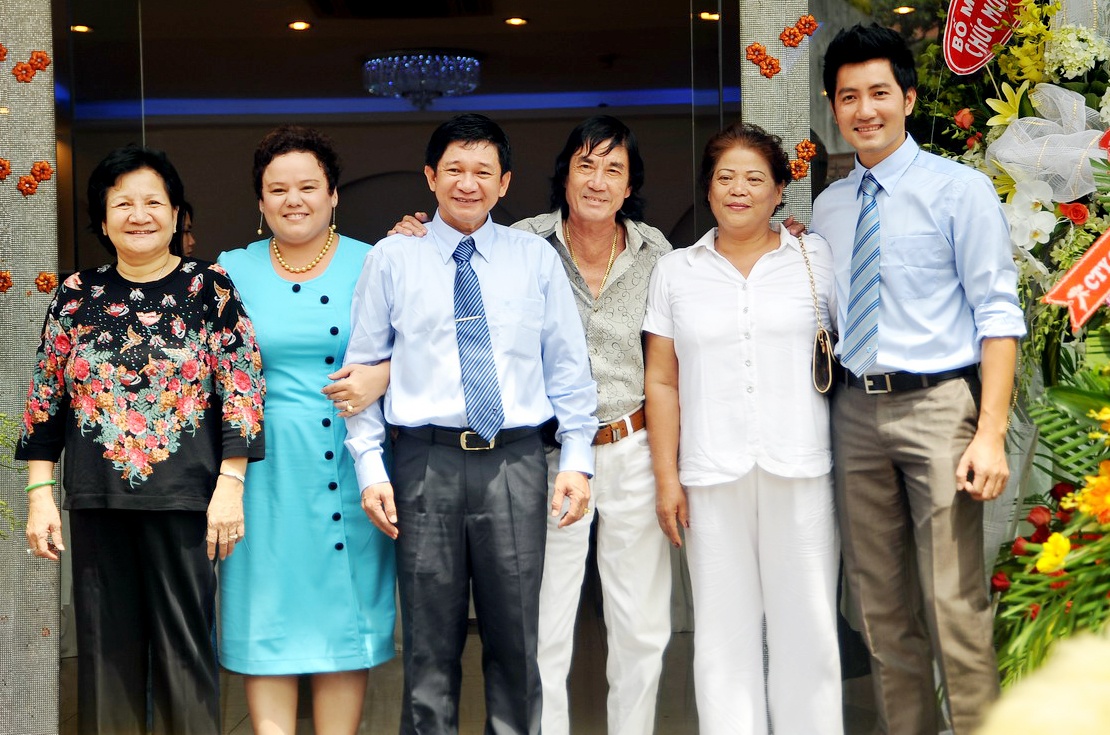 Nguyễn Phi Hùng bên bạn bè, người thân trong ngày khai trương nhà hàng mới.
