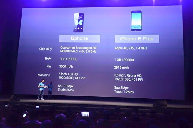 Theo đó, Bphone được trang bị màn hình 5 inch, độ phân giải full HD. Máy chạy chip xử lý Qualcomm Snapdragon 801 MSM8974AC lõi tứ, tốc độ 2,5 GHz, RAM 3 GB, pin 3.000 mAh.