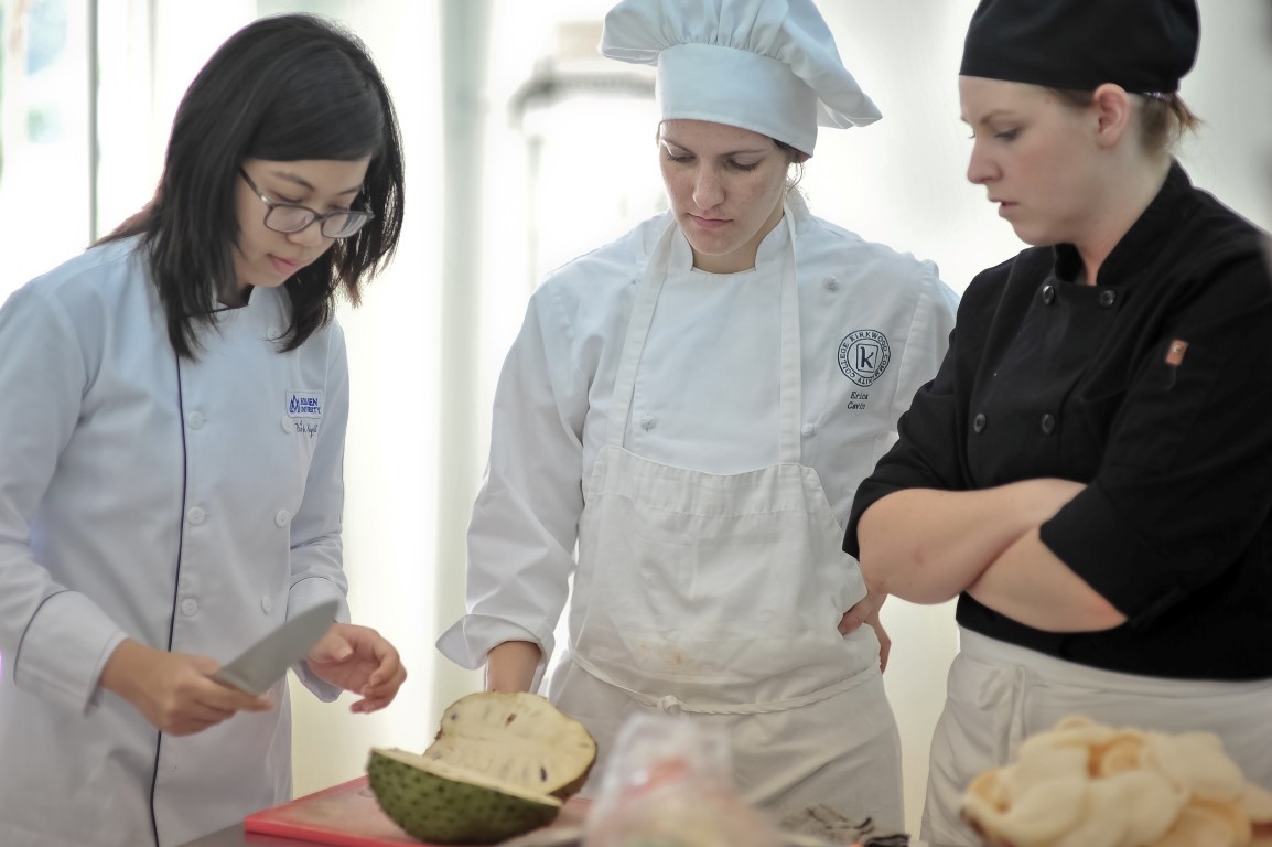 | Sinh viên ngành Nhà hàng - Khách sạn trường ĐH Hoa Sen thực hành trình bày trái cây. |