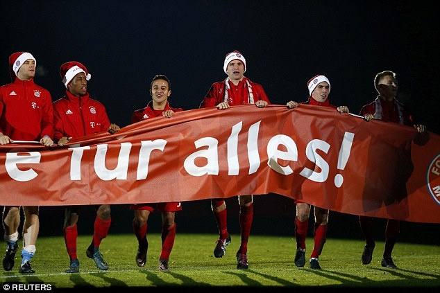 | Bayern Munich gửi lời chúc Giáng sinh và năm mới đến CĐV nhà trong trận đấu cuối cùng của năm 2015 ở tổ ấm Allianz Arena. Ảnh: Reuters. |