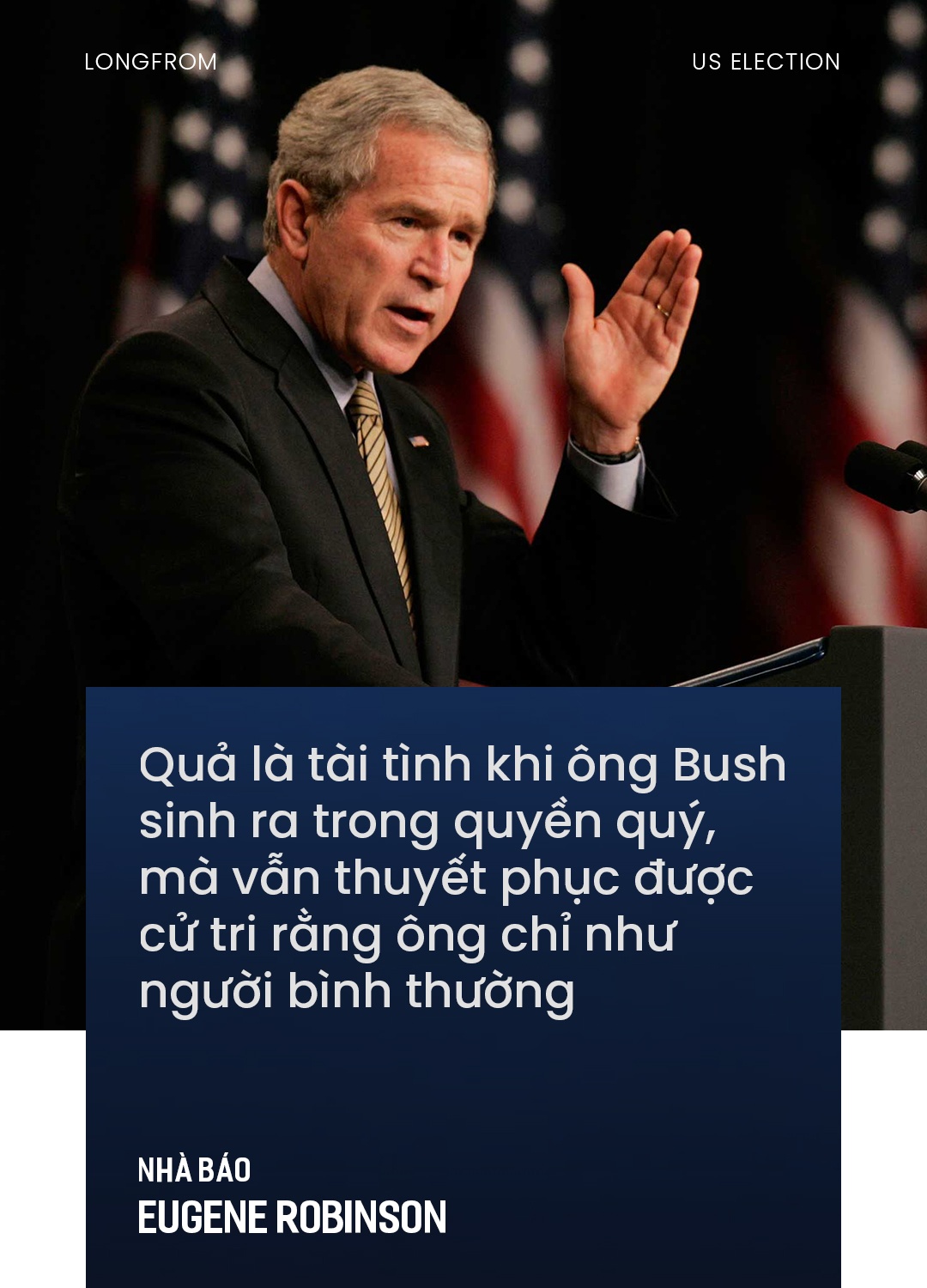 “Nếu suy ngẫm một chút, quả là tài tình khi ông ta được sinh ra trong quyền quý, ở tầng lớp danh vọng nhất của xã hội Mỹ, mà làm cách nào đó vẫn thuyết phục được nhiều cử tri rằng ông chỉ như người bình thường”, nhà báo Eugene Robinson nói với PBS.