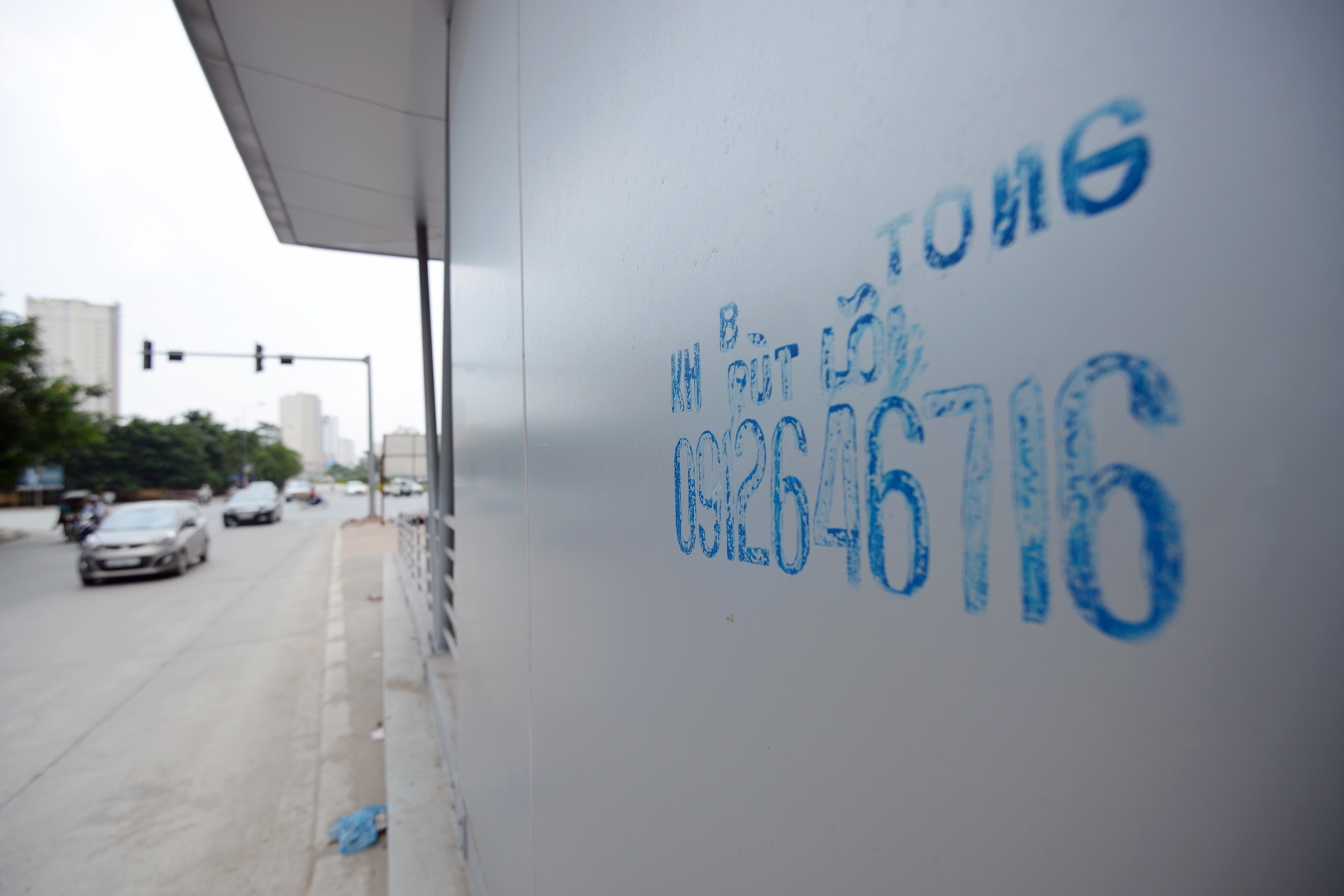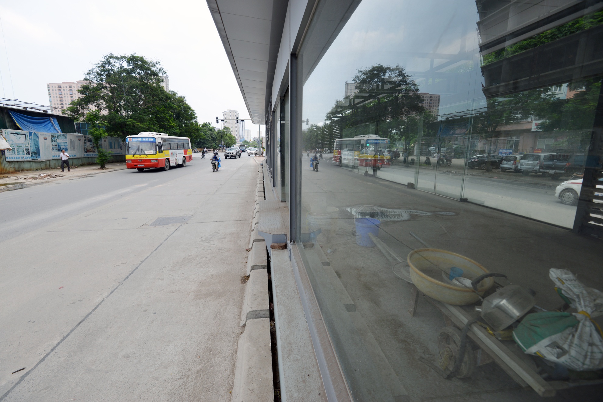 Nhà chờ xe buýt hiện đại, tiêu chuẩn quốc tế đầu tiên ở Hà Nội khánh thành cách đây gần hai tháng đang bị bụi, cũ bẩn, quảng cáo rao vặt tấn công và bị bỏ hoang ít nhất 1 năm nữa.