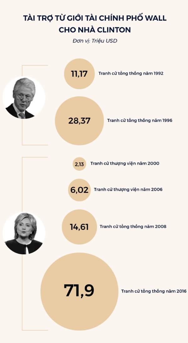 Sức mạnh tài chính của bà Clinton được xây dựng trên một “đội quân” nhà tài trợ hùng hậu. Trong một điều tra năm 2015, Washington Post mô tả mạng lưới này được liên kết đầy tinh vi với nhiều mạnh thường quân tại Mỹ và trên toàn cầu trong hơn 4 thập kỷ hai vợ chồng nhà Clinton làm chính trị.