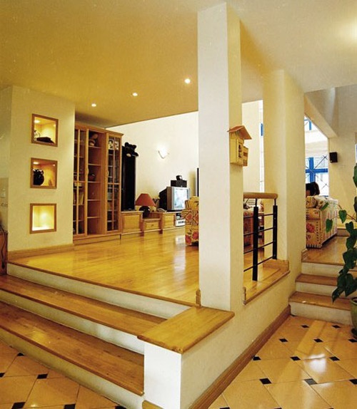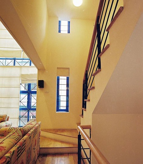 | Chủ nhà cũng như kiến trúc sư đều học ở Đức về, nên rất tâm đắc với nhau về nét công năng và thực tế mà vẫn bay bổng trong kiến trúc cũng như trong nghệ thuật của người Đức. Cầu thang chạy dọc nhà nối từ ga-ra lên các tầng lầu trên. Phòng khách rộng rãi, đẹp mắt với bộ sofa điệu đà. |