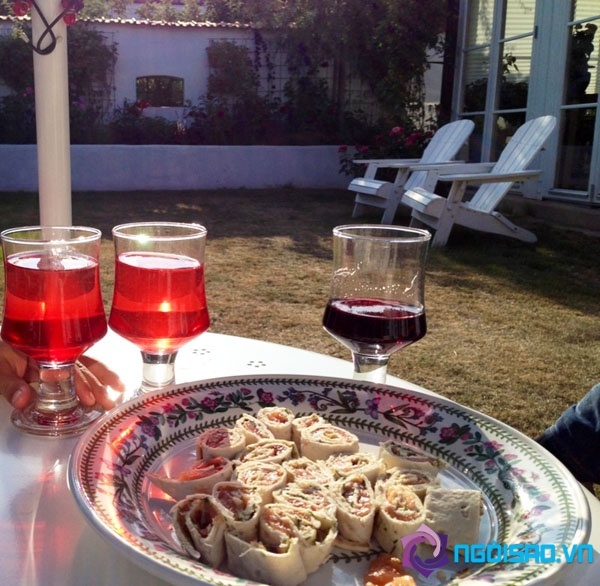 | Ngoài ra, bàn ăn còn đặt ngoài vườn với trái cây, bánh ngọt. |