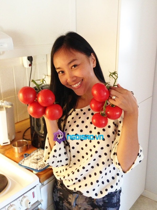| Nữ ca sĩ cùng những quả cà chua chín mọng hái trong vườn. |