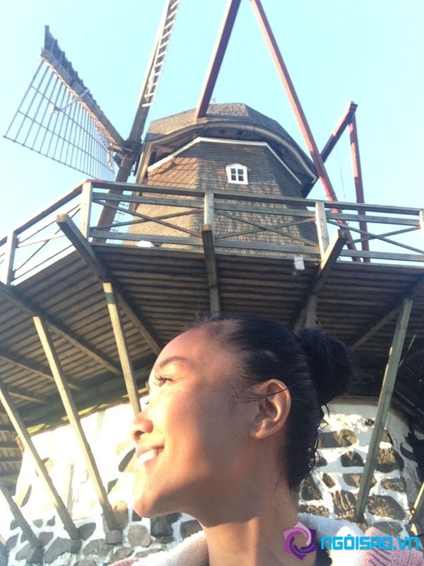 | Đoan Trang bên chiếc cối xay gió thật to. Đây cũng là một trong những điểm đặc trưng của thành phố, chiếc cối xay gió còn gắn liền với những trò chơi tuổi thơ của ông xã. |