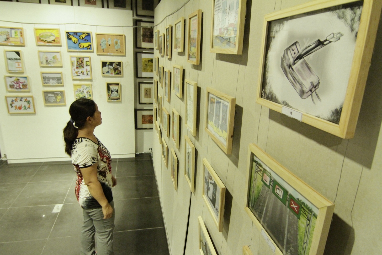| Phòng triển lãm đã treo kín tường các bức tranh vẽ biếm họa, tranh trừu tượng, các bức phác họa Hà Nội... |