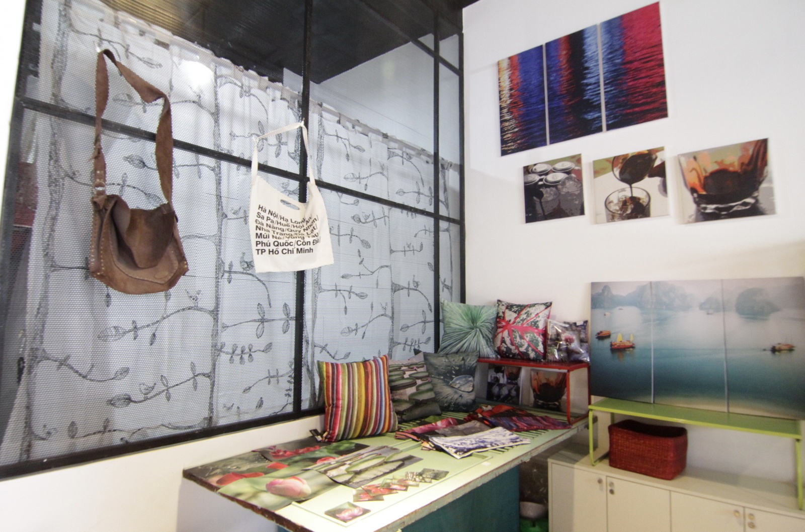 | Gian hàng bán gối, túi xách, ví... có in hình phong cảnh đất nước Việt Nam của một người Úc. |