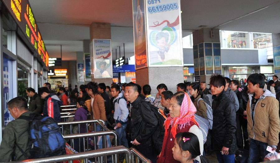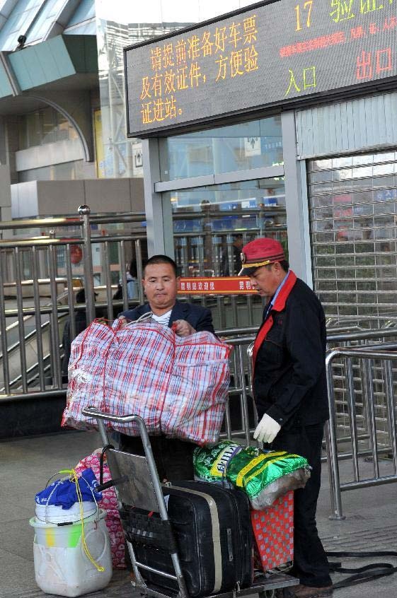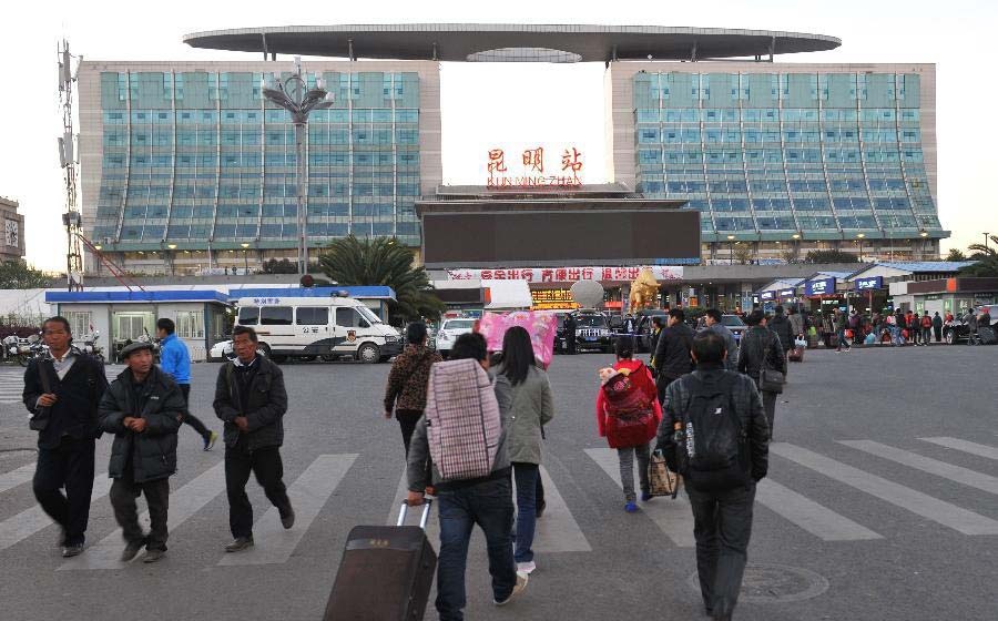 | Người dân chất hành lý tại ga Côn Minh. Theo ban quản lý nhà ga Côn Minh, các chuyến tàu khởi hành từ nhà ga không phải hủy hay hoãn bởi vụ tấn công. |