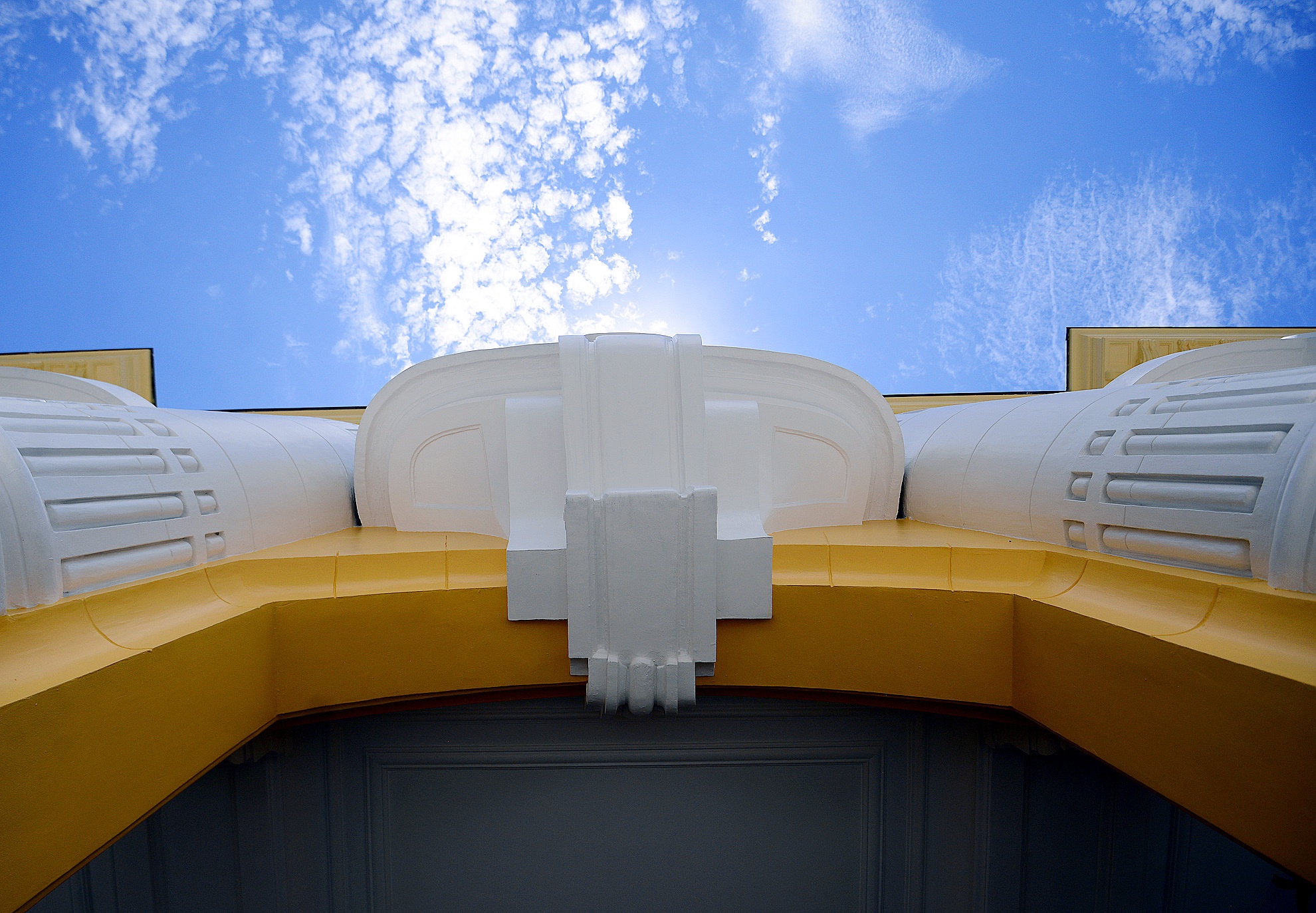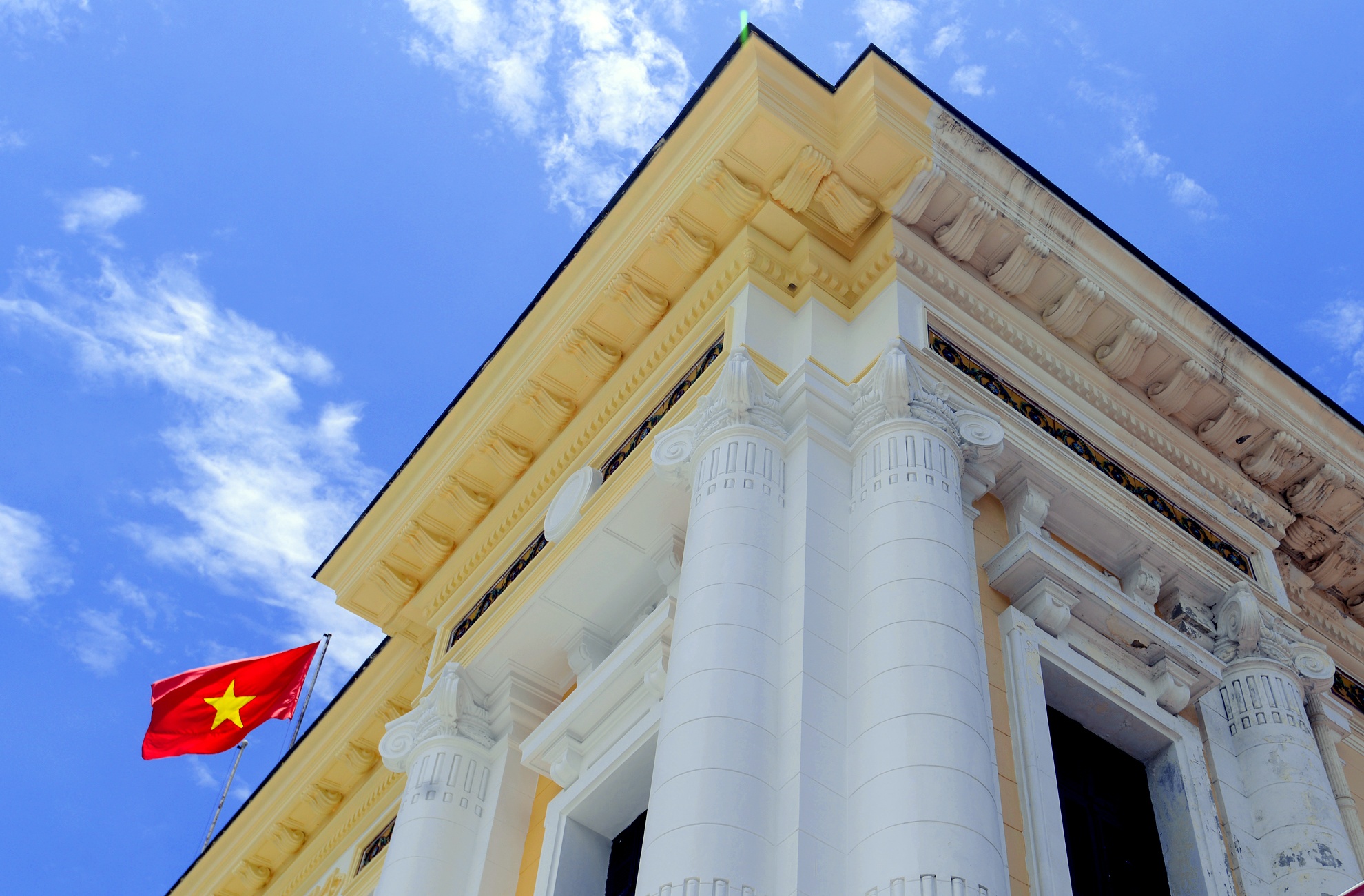 Cửa Nhà hát Lớn từ góc nhìn ngược lên nền trời xanh.