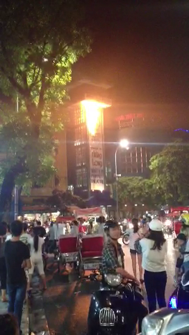 Thông tin ban đầu cho biết, nguyên nhân dẫn tới vụ cháy có thể là do tấm biển báo điện tử bị chập điện.| Clip cháy nhà hát múa rối (Nguồn: Người dùng Youtube). |