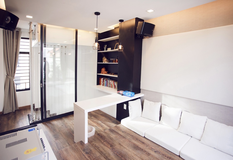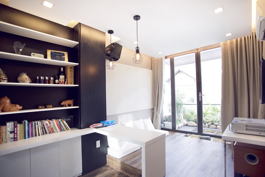Đỗ Long cho biết, sau nhiều năm lao động, anh vừa tự thưởng cho mình một căn nhà nhỏ xinh xắn nằm ở quận 4, TP.HCM. Căn nhà được mua lại với giá 1,8 tỷ và được chính chủ nhân cho sửa chữa, trang trí nội thất theo đúng ý mình. Vì diện tích nhà khá nhỏ gọn nên nội thất của các gian phòng cũng được tối giản. Thay vì sử dụng bộ bàn ghế salon sang trọng, nam chủ nhân chỉ dùng một băng ghế đặt sát tường, tạo khoảng không cho tầng trệt..
