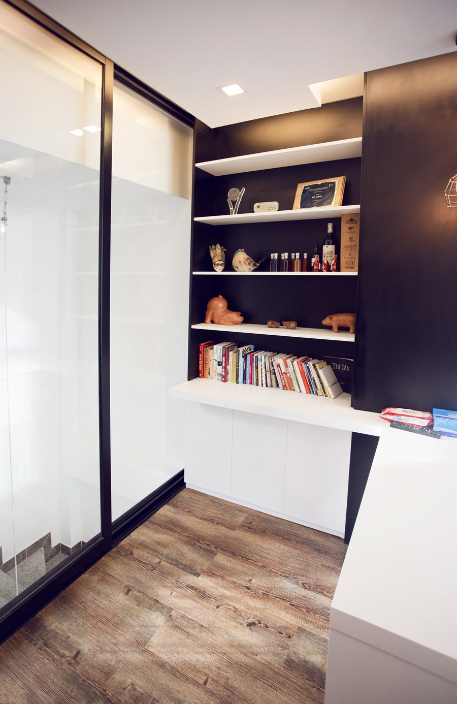Kệ sách được bày trí ngăn nắp là nơi trưng các món lưu niệm mà anh tậu từ những chuyến xuất ngoại.