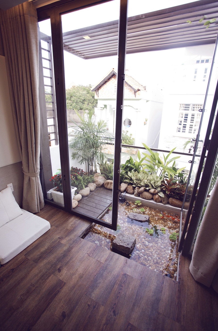 Đỗ Long cho hay, anh rất yêu thích không gian nhiên nhiên, vì thế ngoài ban công được thiết kế như một vườn cây nhỏ. Bể cá liên thông với không gian trong căn phòng. Đây cũng là nơi thư giãn, xả stress của nam chủ nhân.