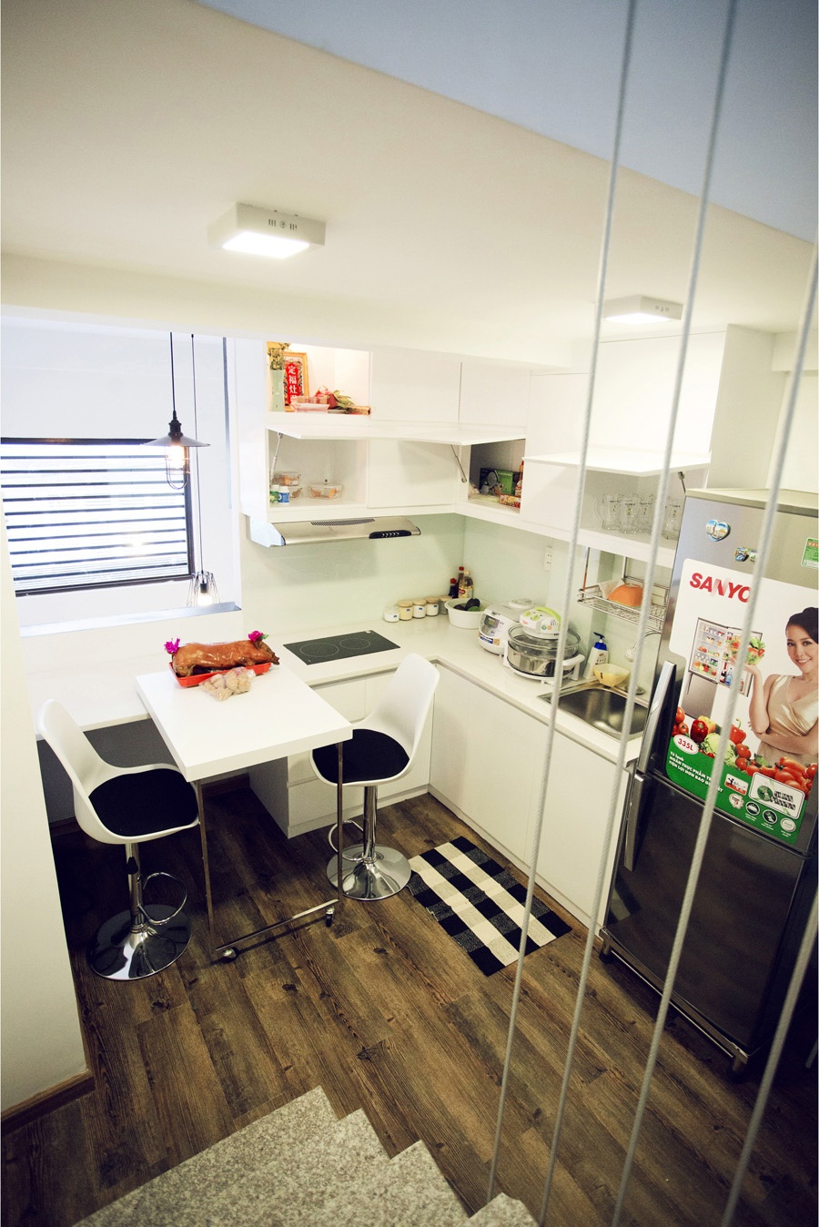 Tầng lửng là gian bếp nhỏ nhắn vừa đủ phục vụ cho anh chàng độc thân với những vật dụng cần thiết. Bàn ăn dành cho hai người được đặt khéo léo trong không gian nhỏ. Trước đó, Đỗ Long tiết lộ, anh mua căn nhà với giá 1,8 tỷ và chi hơn 500 triệu cho việc sửa chữa, mua sắm nội thất. Theo Đỗ Long, với số tiền này anh có thể mua căn hộ nhưng gần đây các vụ hỏa hoạn thường xảy ra tại chung cư khiến anh lo lắng và có cảm giác không an toan, vì thế, nam stylist đình đám showbiz Việt đã quyết định tậu nhà mặt phố thay vì mua căn hộ như ý định ban đầu.